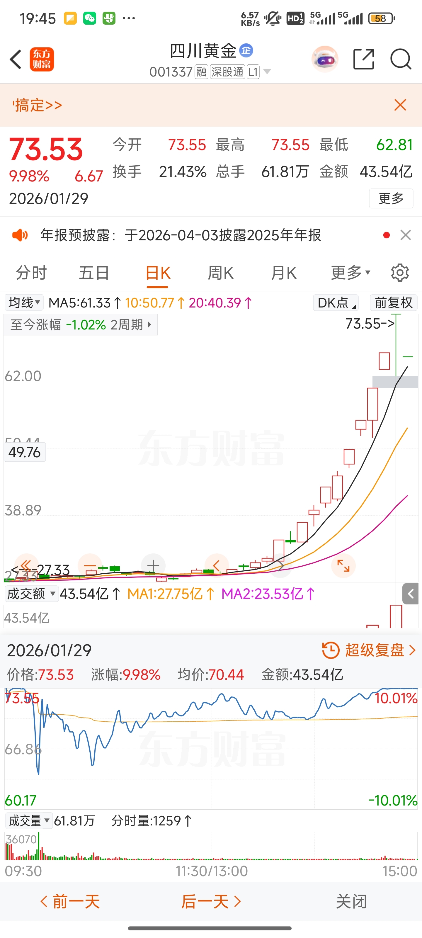 $中国黄金(SH600916)$ $四川黄金(SZ001337)$ 四川金子表演了一整天换脸就是不封板,第2天焊死跌停。。。。。埋了43亿