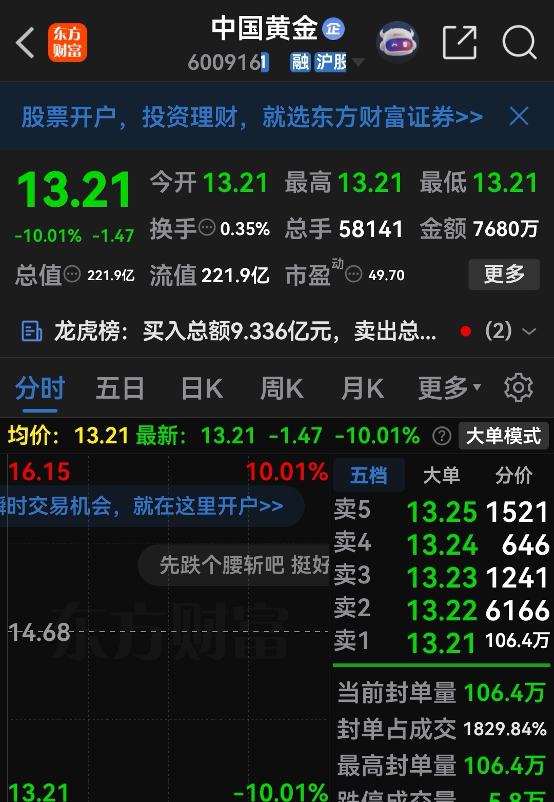 以13.28挂单买回14.85卖掉的中国黄金,嘿!还真的开盘就是跌停板,娘嗳!没