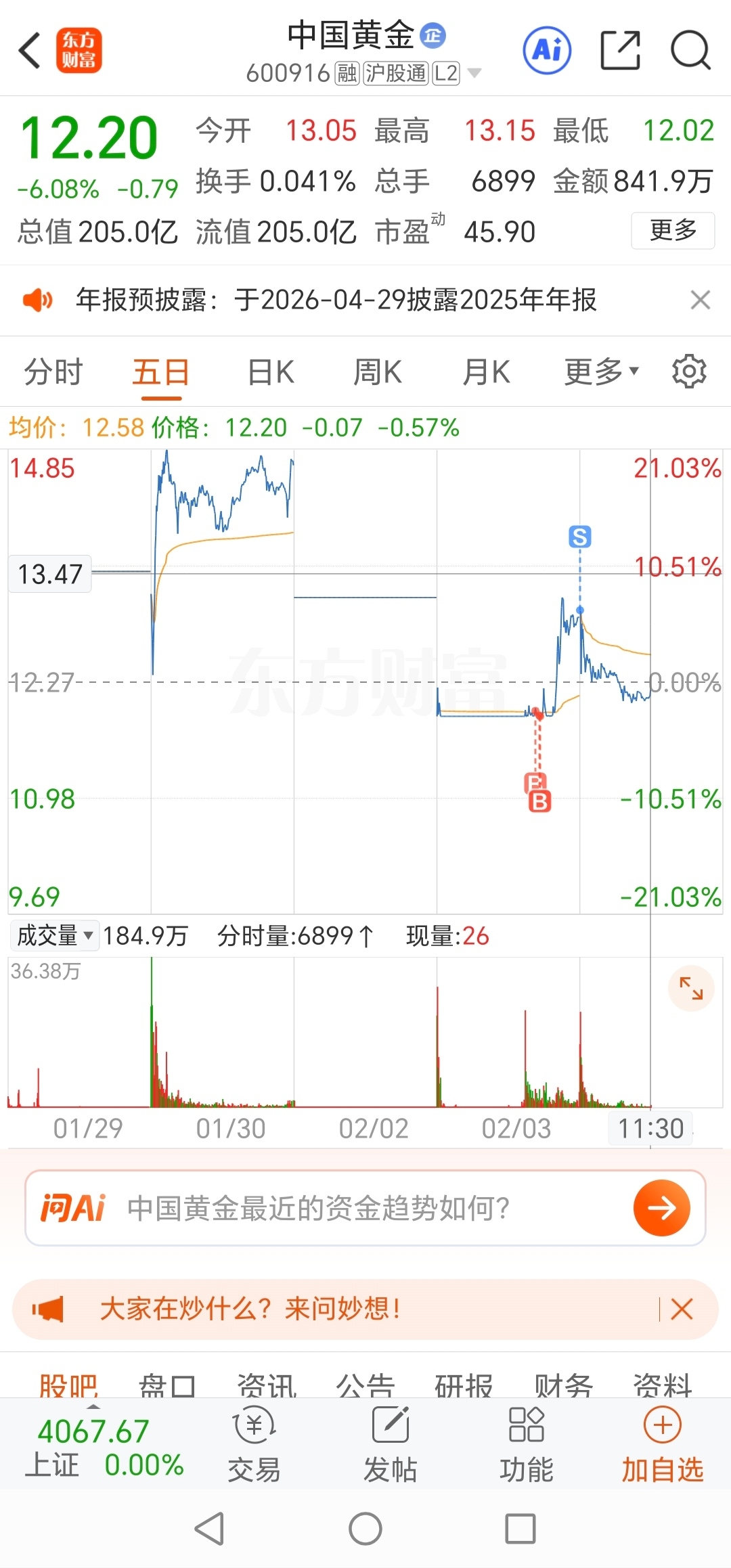 $中国黄金(SH600916)$ 早上看集合竞价慌不择路的跑了,如果真的想大家上去就不可能那么低的竞价。至少得五个点以上才对吧。可惜我昨天只买了300股
