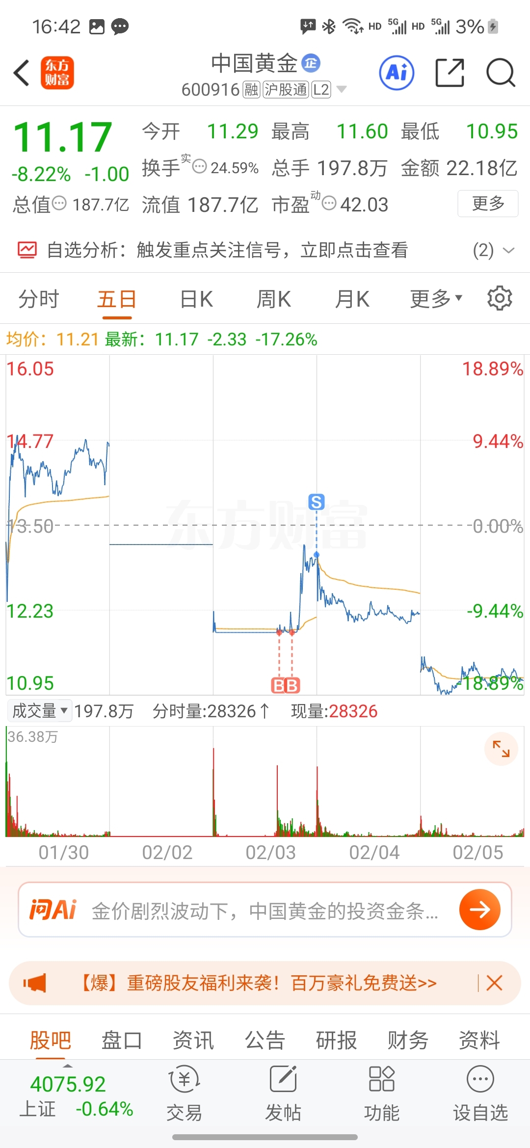 $中国黄金(SH600916)$ 明天我要帮兄弟们接50手