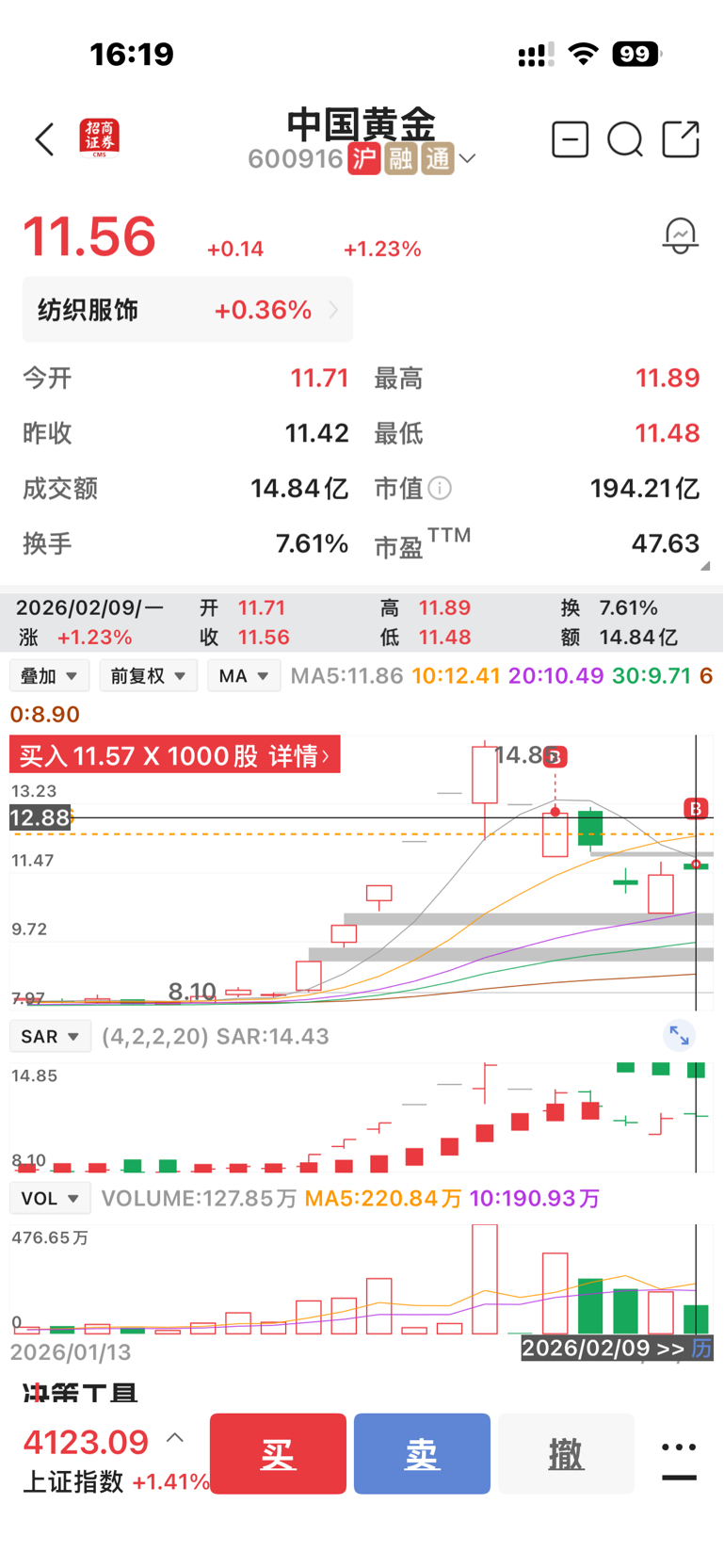 加仓了1000股(11.57),早盘没敢动。其实早盘应该卖出然后在买回。明天看情