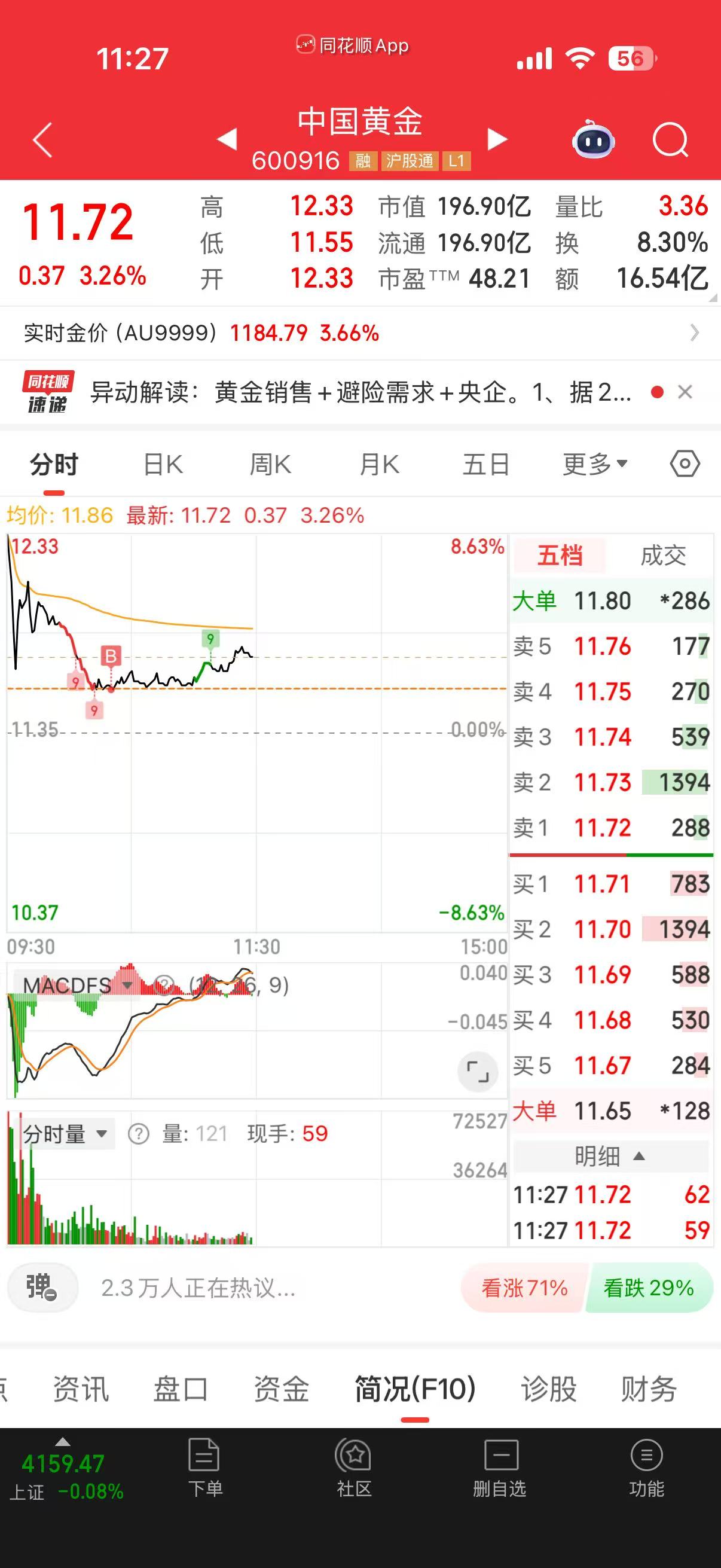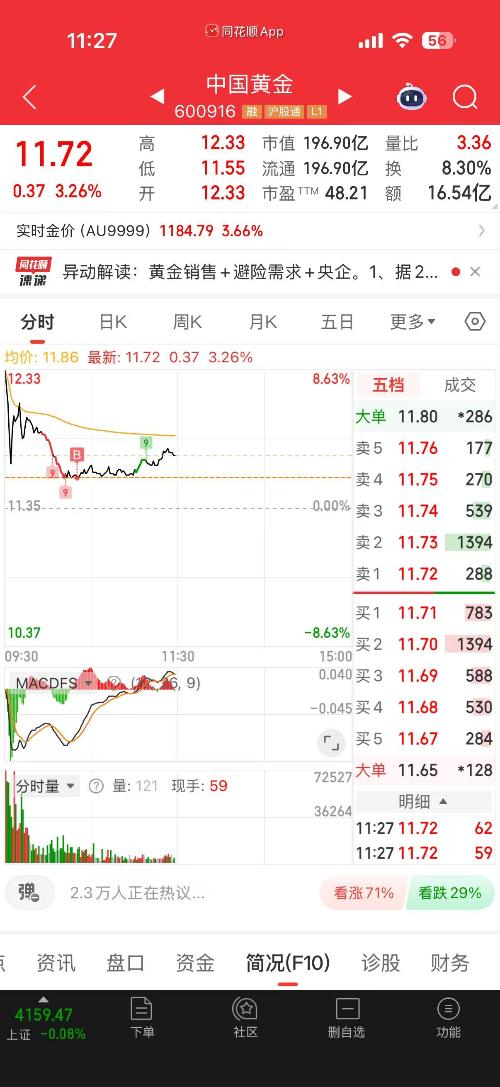 11.56进的,当时看它跌不动了,割了蓝色光标,换过来的,这一波能冲破前期高点1