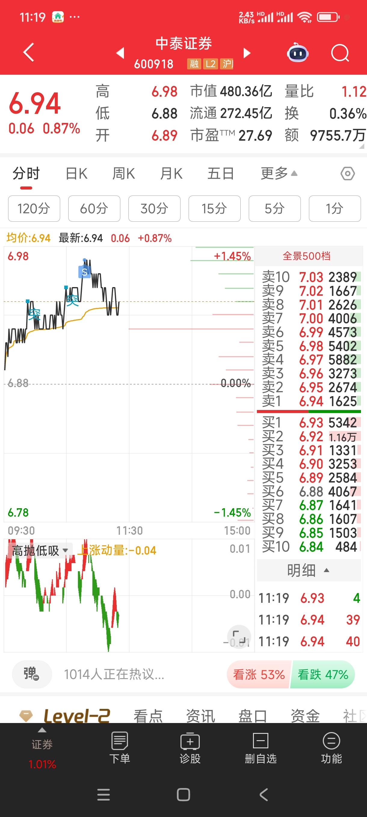 $中泰证券(SH600918)$ 6.97不知是不是短期高点,主力格局小,先出来