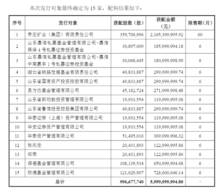 据公告,中泰证券本次发行价格确定为6.02元/股,共吸引了15名投资者参与。其中,控股股东枣庄矿业(集团)有限责任公司(下称“枣矿集团”)作为最大认购方,认购约3.6亿股,获配金额达21.65亿元,限售期为60个月。