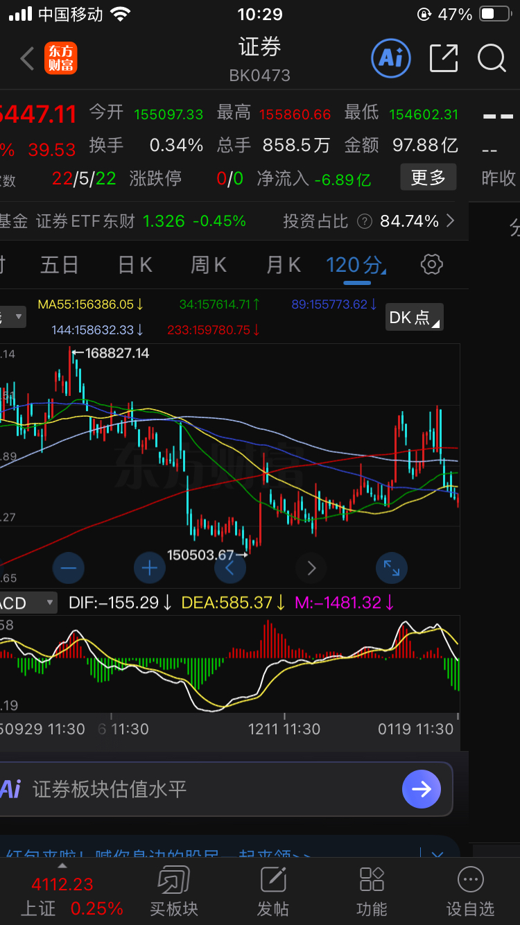 按板块及其大多数个股120分钟级别均线态势判断——进入横盘(锯齿)筑底初期。无非