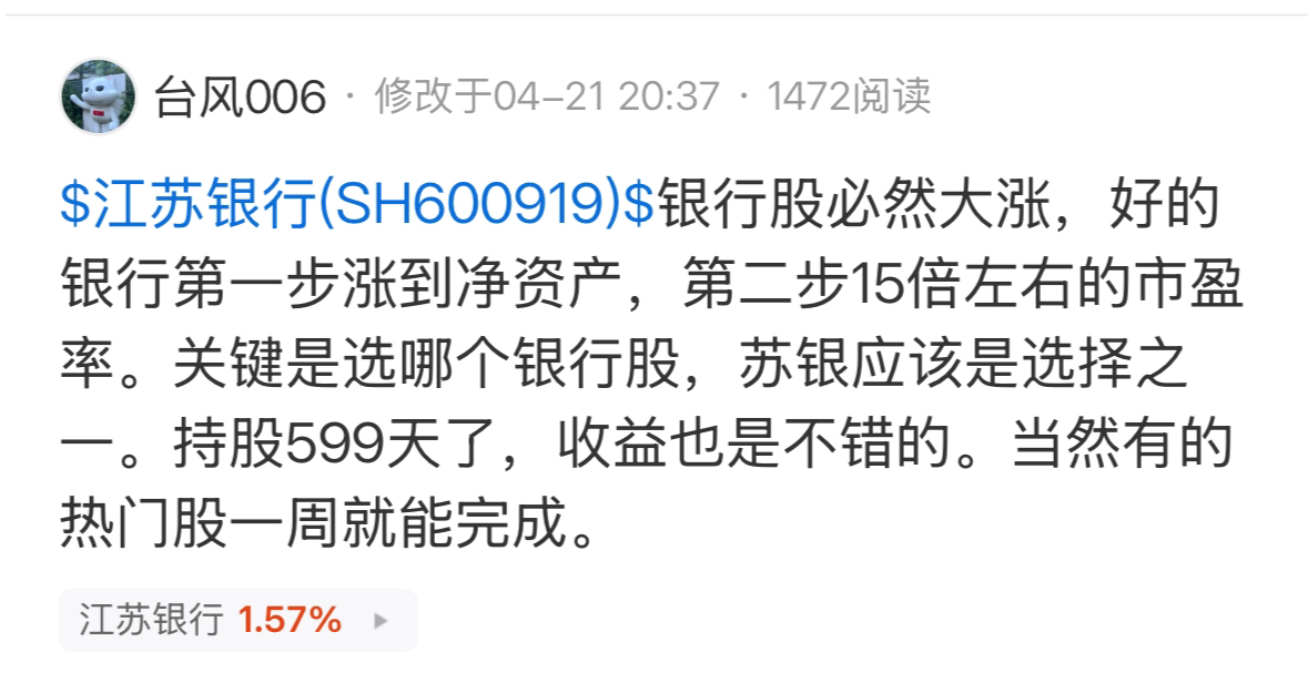 江苏银行新高了。回顾下去年4月21日的帖子。恭喜所有坚定的人。持股有800天了吧
