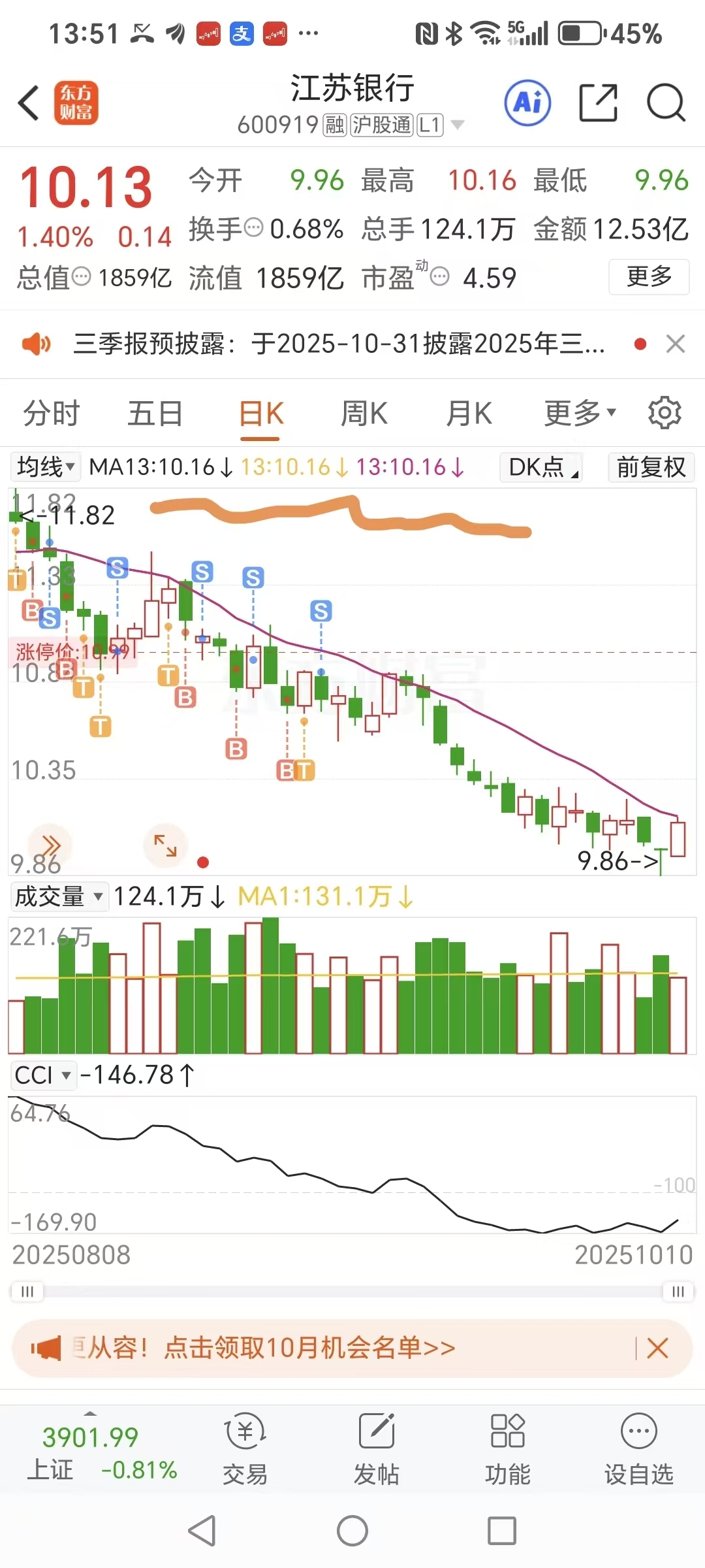 $江苏银行(SH600919)$ 大家看看准不准?10.16分界线就差这么一哆嗦站上就好了!差点量能没跟上