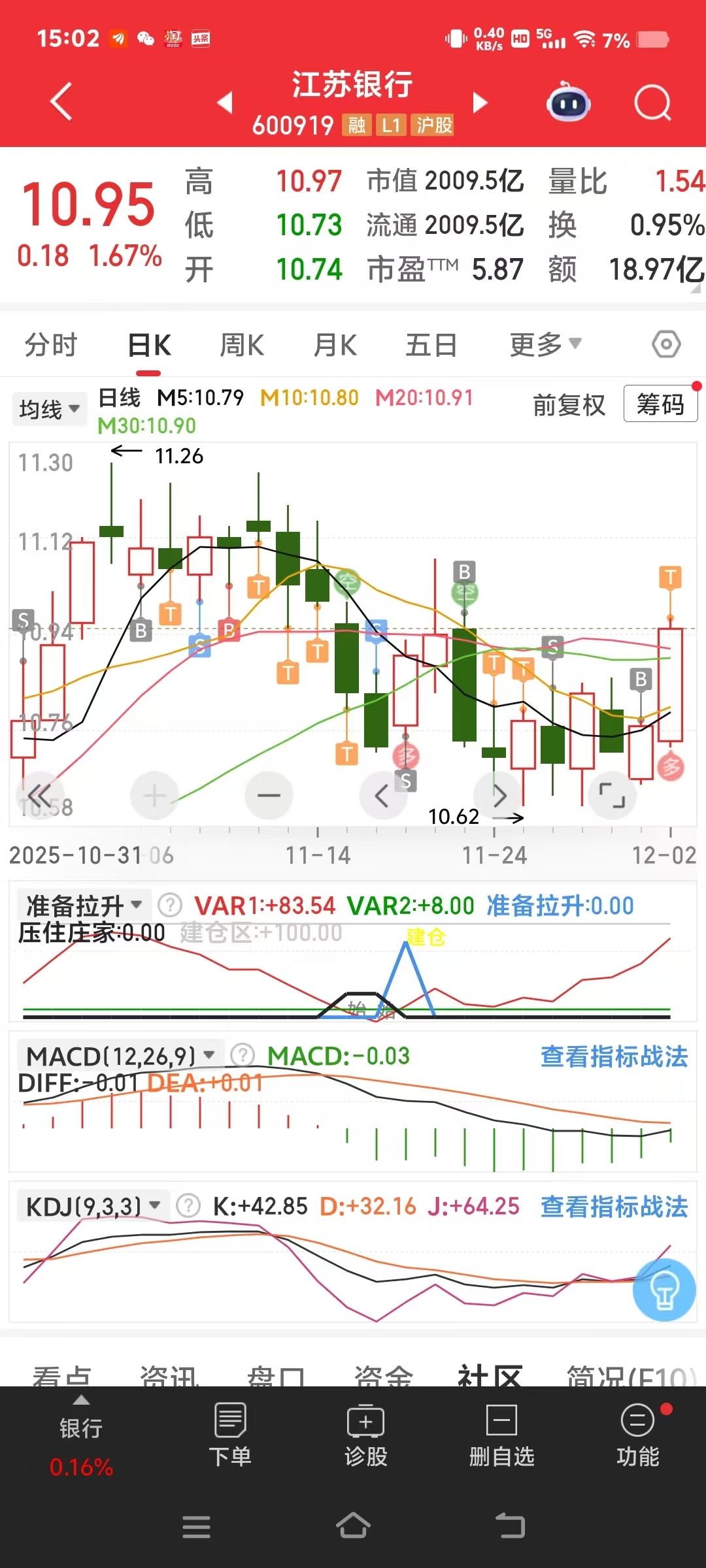 $江苏银行(SH600919)$ 今天江行还是比较给力的!昨天10.70建仓,今早做T下午补回,没让我失望!