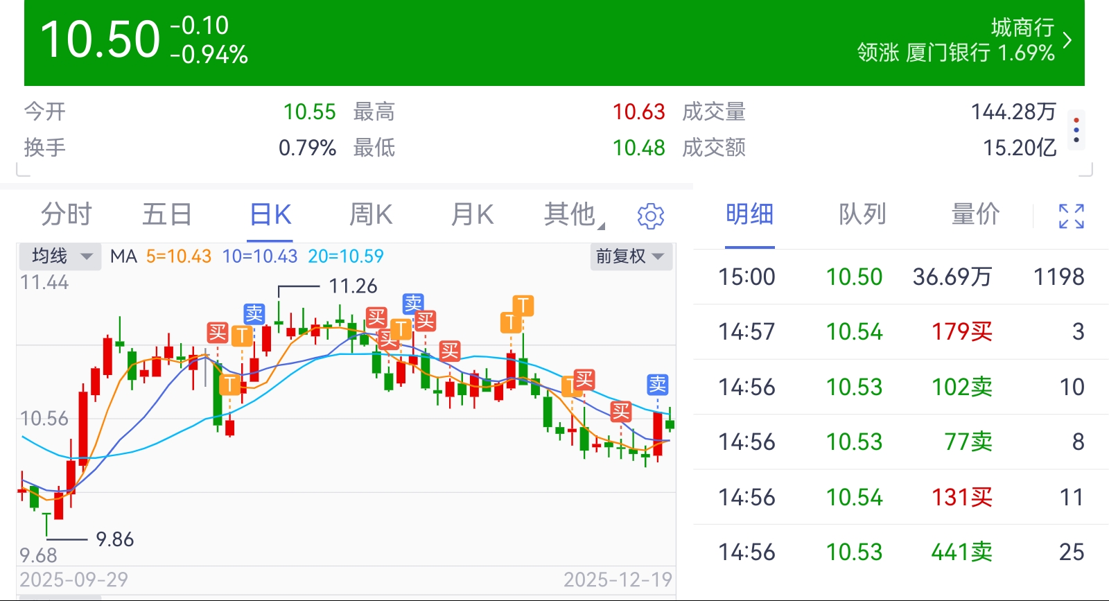 一整天没有太大压力,尾盘36.69万手成交算是利空出尽,江银还是很讲究的,毕竟每年的增长放在那里的,大家有目共睹,业绩在城商行里也是前三,慢慢攒股留作养老吧。通过多次买卖及做T,目前成本10.10元。