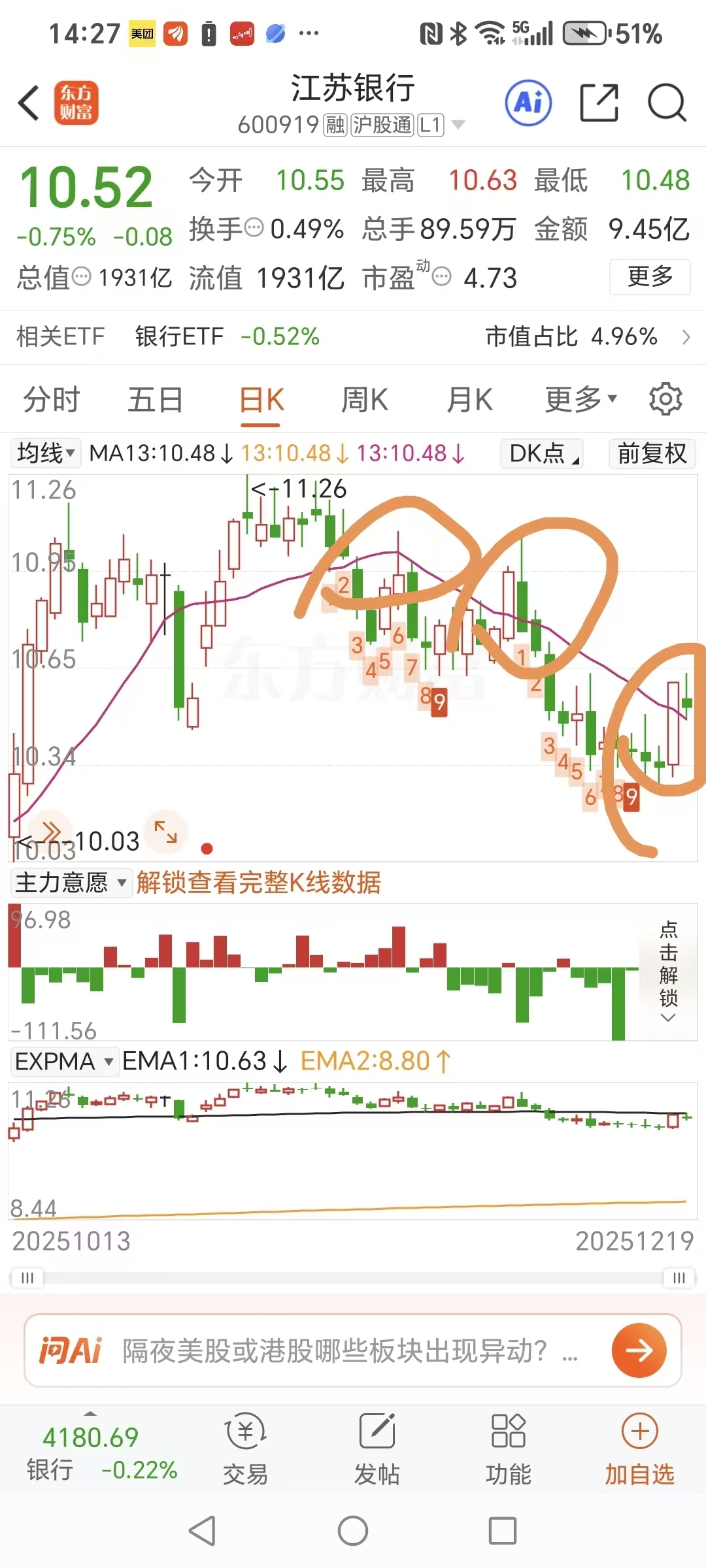 今天江苏银行选择冲高回落态势,在没确认回踩10.48趋势线成功前多看少动为好。