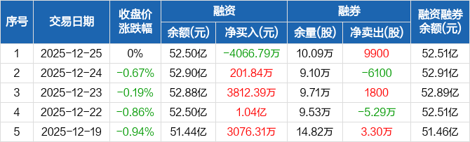 江苏银行:融资净偿还4066.79万元,融资余额52.5亿元(12-25)