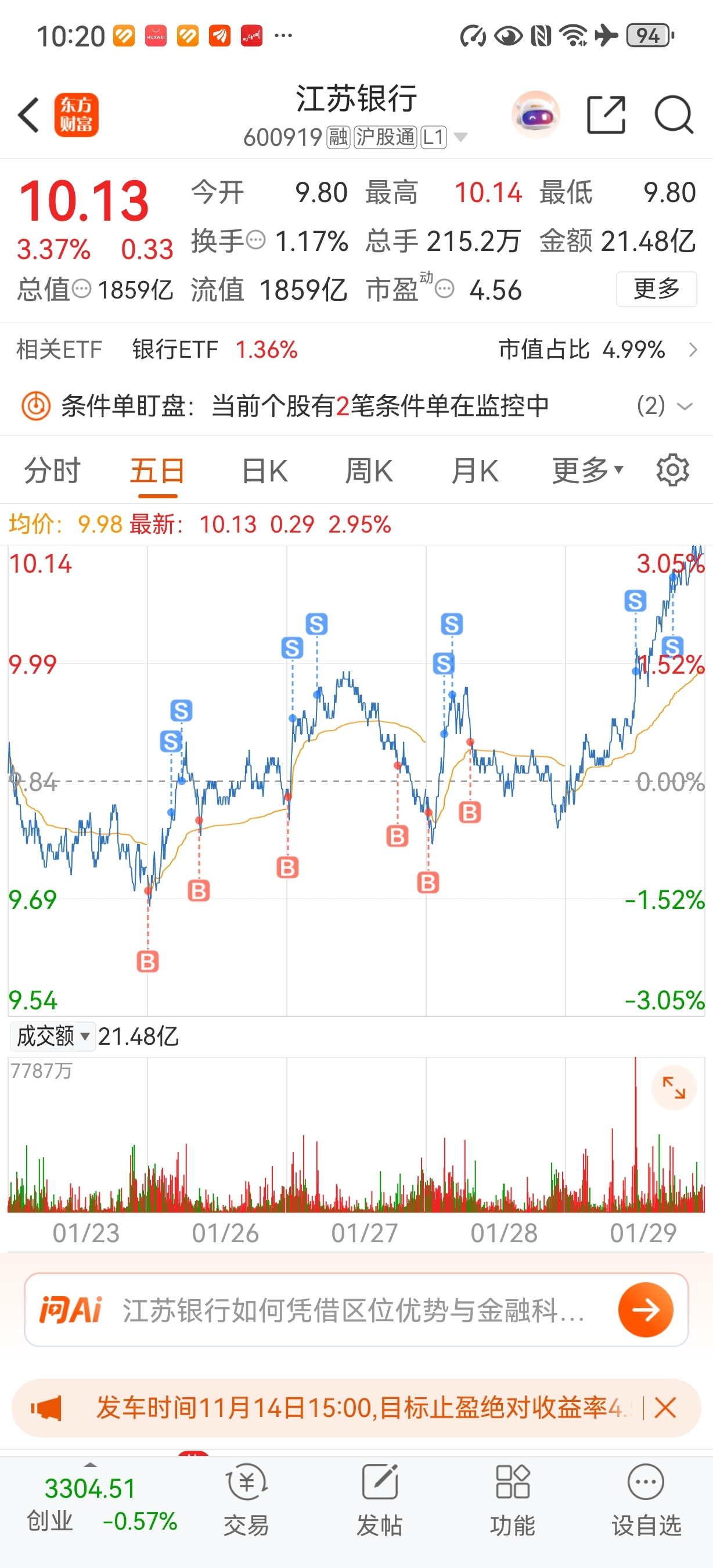 $江苏银行(SH600919)$ 没办法,价格买高了。只能做T降成本。目前还亏点不多。加油,把成本搞下去。