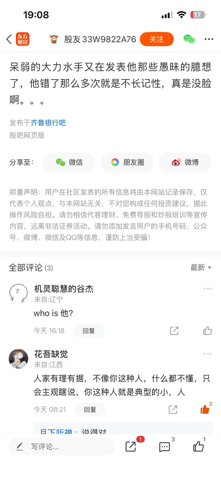 温馨提示: 1.根据《证券法》规定,禁止编造、传播虚假信息或者误导性信息,扰乱证券市场;2.用户在本社区发表的所有资料、言论等仅代表个人观点,与本网站立场无关,不对您构成任何投资建议。用户应基于自己的独立判断,自行决定证券投资并承担相应风险。《东方财富社区管理规定》