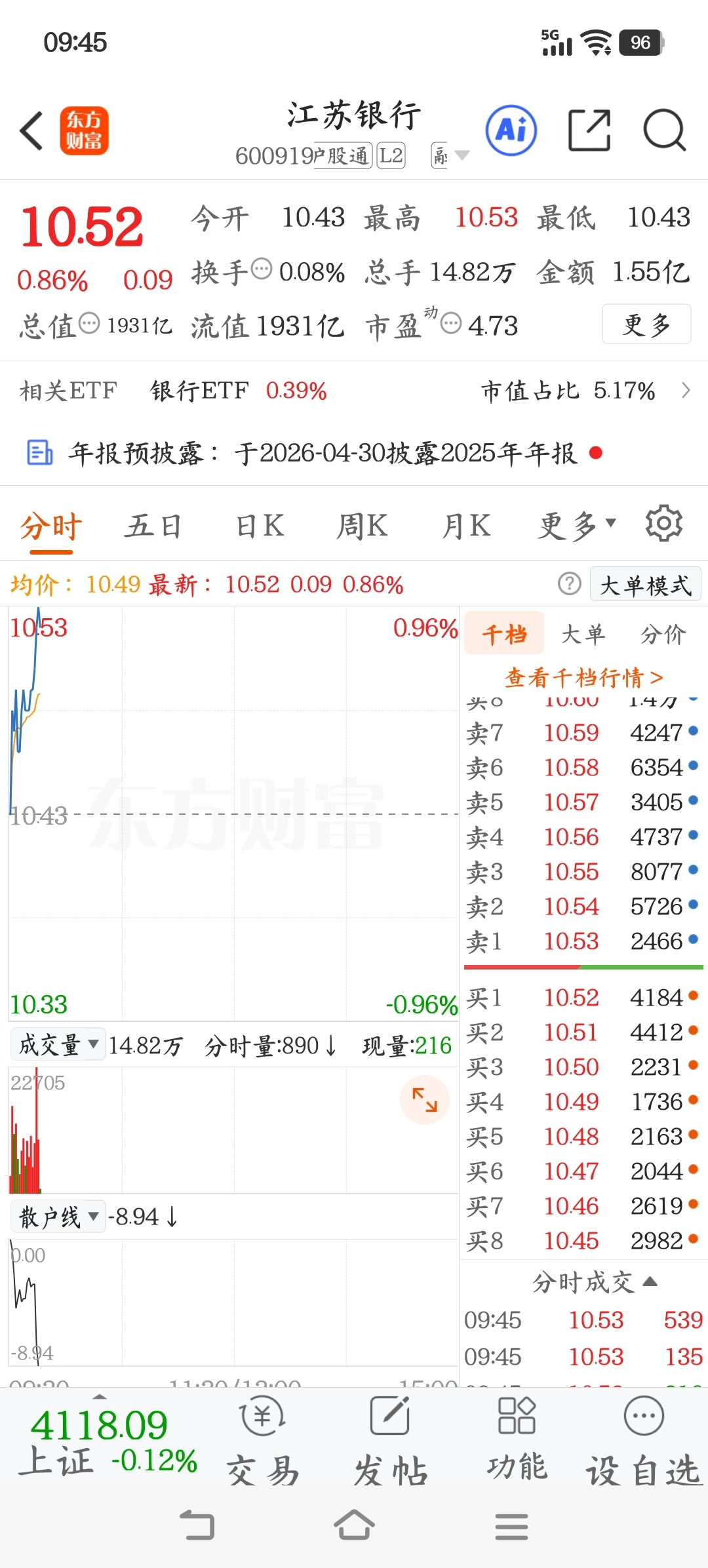 $江苏银行(SH60091股友们,一月9号买的江苏银行,建仓成本是10.46元,