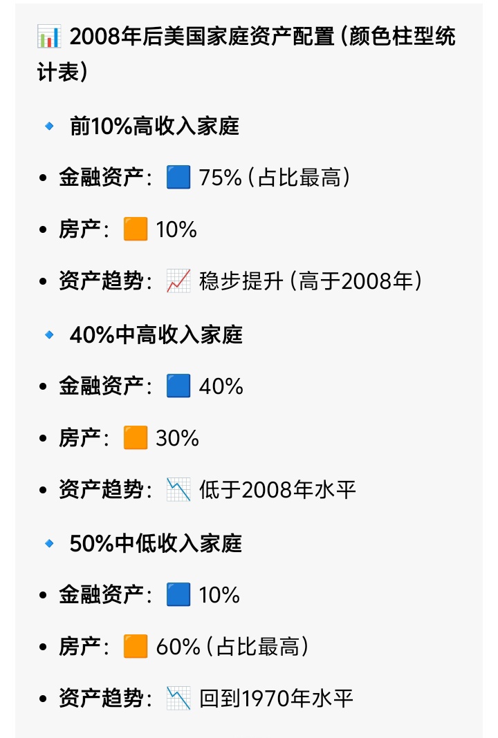 $江苏银行(SH600919)$ 2008金融危机后,美国家庭资产不同配置及后续趋势,对中国有何启示?随着居民储蓄搬家,中国家庭资产是否应该配置更多金融资产?在A股比较恶劣生态中,应该配置什么样的金融资产才有利于资产增值?