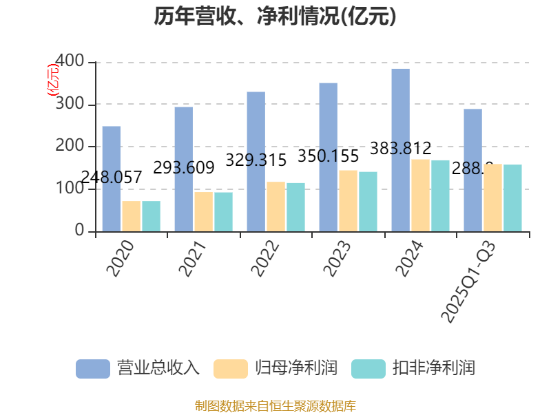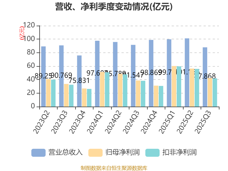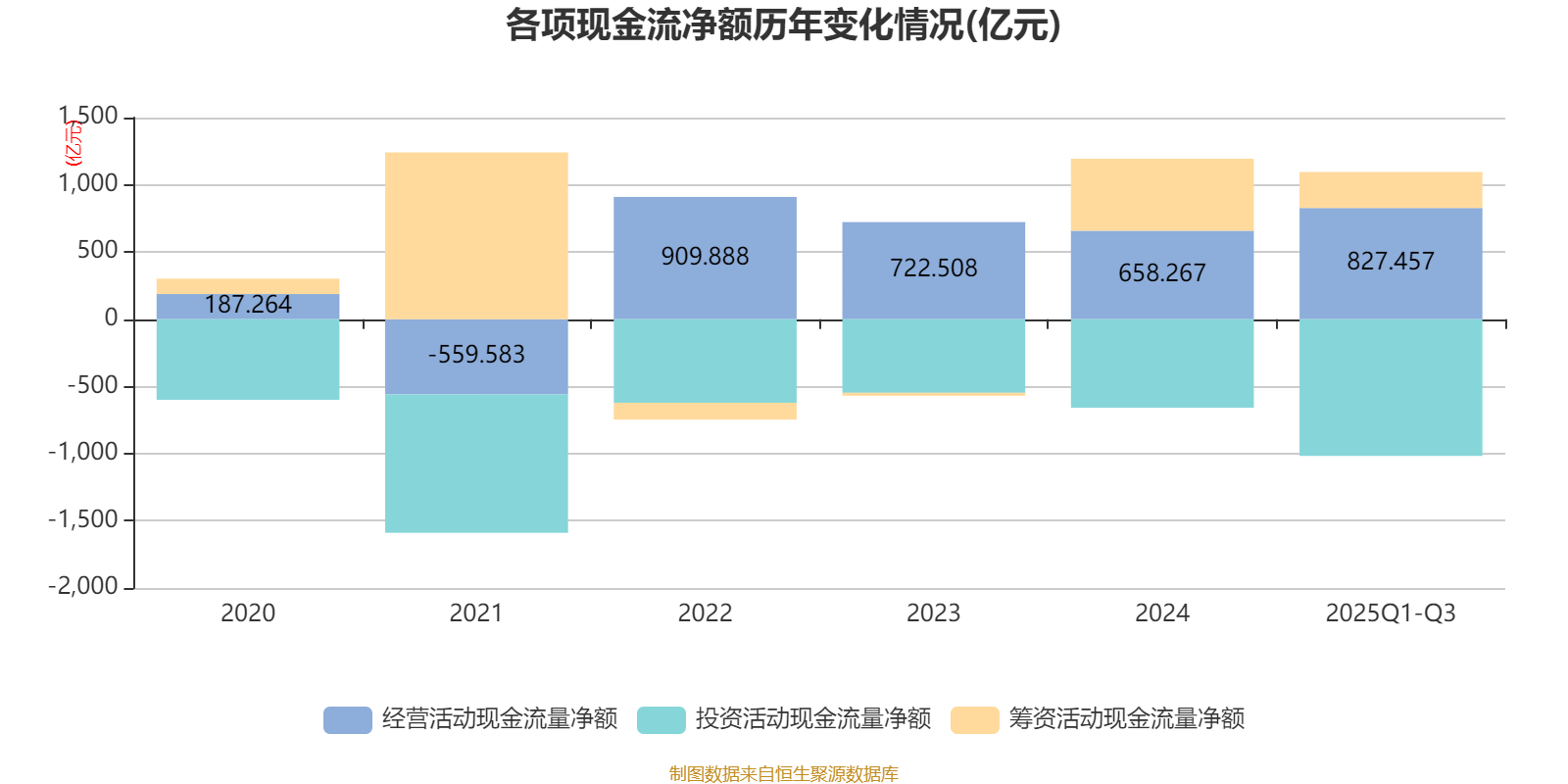 2025年前三季度,公司经营活动现金流净额为827.46亿元,同比增长311.71%;筹资活动现金流净额267.52亿元,同比减少59.61亿元;投资活动现金流净额-1017.1亿元,上年同期为-491.08亿元。