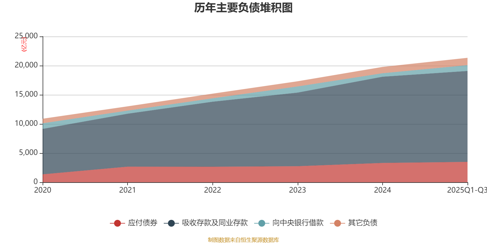 负债重大变化方面,截至2025年三季度末,公司吸收存款及同业存款较上年末增加5.51%,占公司总资产比重下降2.03个百分点;向中央银行借款较上年末增加63.76%,占公司总资产比重上升1.45个百分点;拆入资金较上年末增加53.77%,占公司总资产比重上升0.52个百分点;应付债券较上年末增加5.59%,占公司总资产比重下降0.44个百分点。