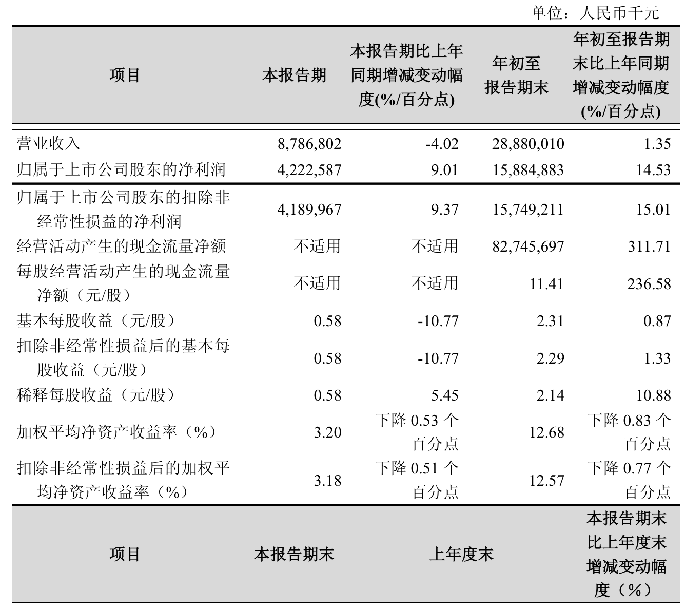 中证智能财讯杭州银行(600926)10月31日披露2025年第三季度报告。前三季度公司实现营业总收入288.8亿元,同比增长1.35%;归母净利润158.85亿元,同比增长14.53%;扣非净利润157.49亿元,同比增长15.01%;经营活动产生的现金流量净额为827.46亿元,同比增长311.71%;报告期内,杭州银行基本每股收益为2.31元,加权平均净资产收益率为12.68%。