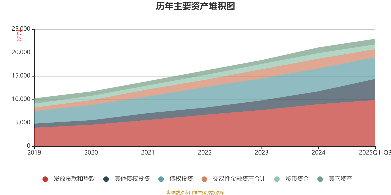 资产重大变化方面,截至2025年三季度末,公司其他债权投资较上年末增加65%,占公司总资产比重上升6.72个百分点;债权投资较上年末减少4.57%,占公司总资产比重下降2.8个百分点;交易性金融资产合计较上年末减少18.58%,占公司总资产比重下降2.51个百分点;买入返售金融资产较上年末减少55.39%,占公司总资产比重下降1.41个百分点。