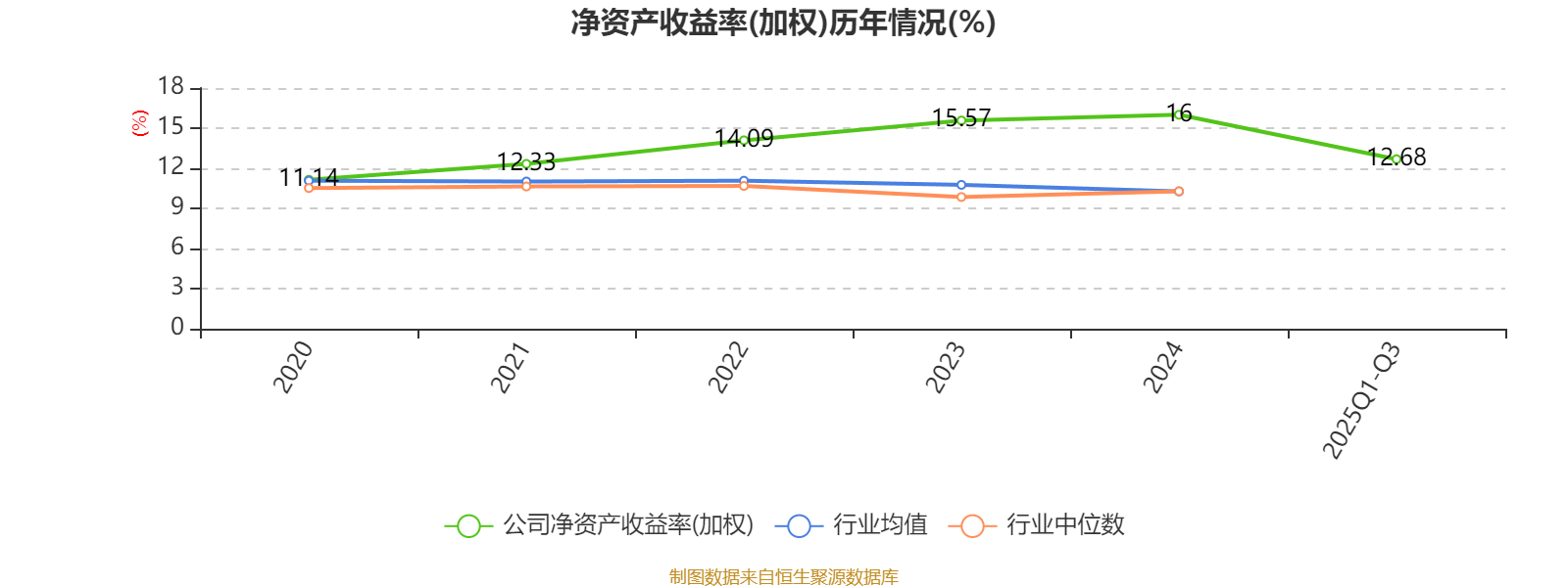 盈利能力方面, 2025年前三季度公司加权平均净资产收益率为12.68%,同比下降0.83个百分点。