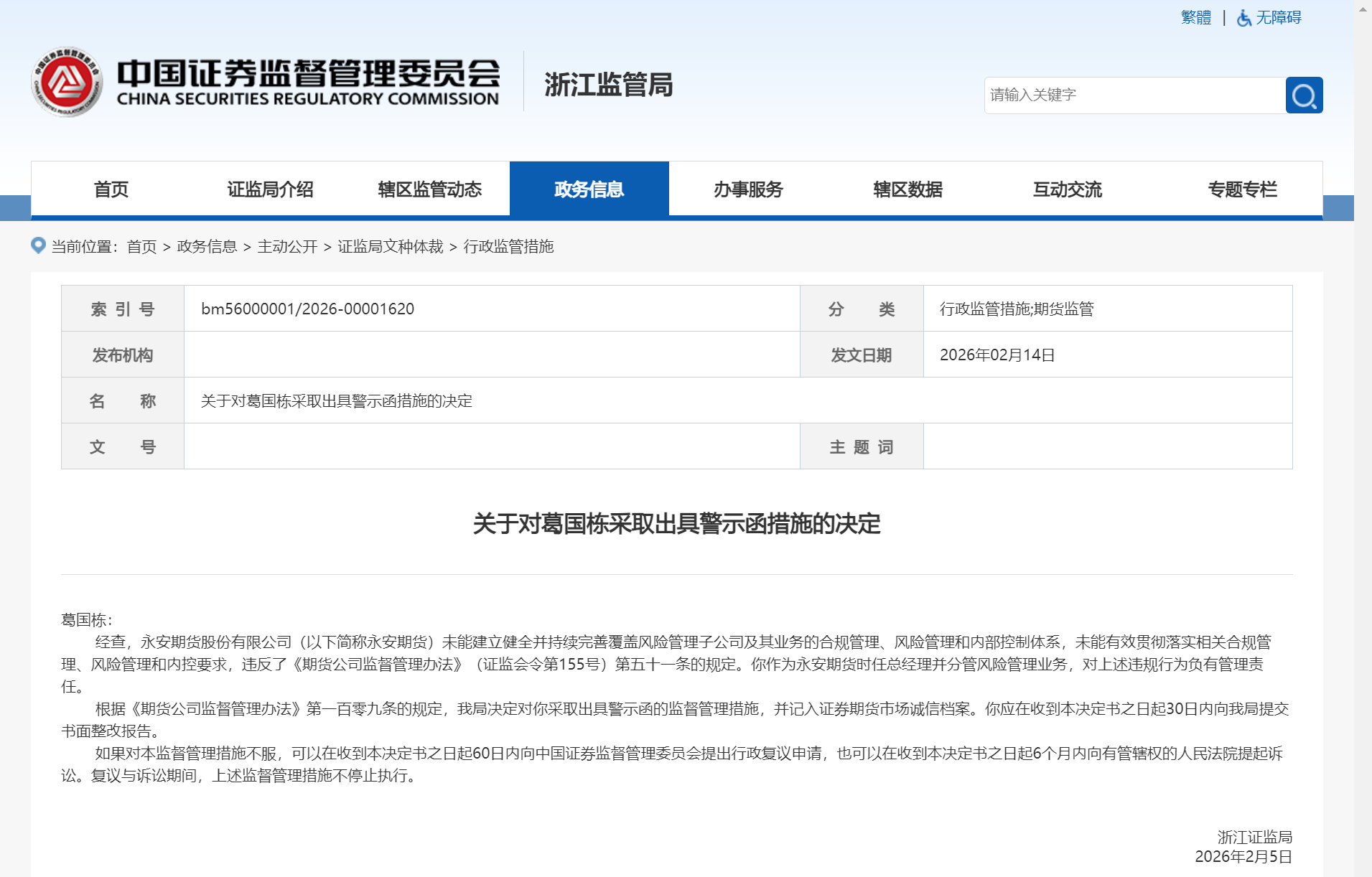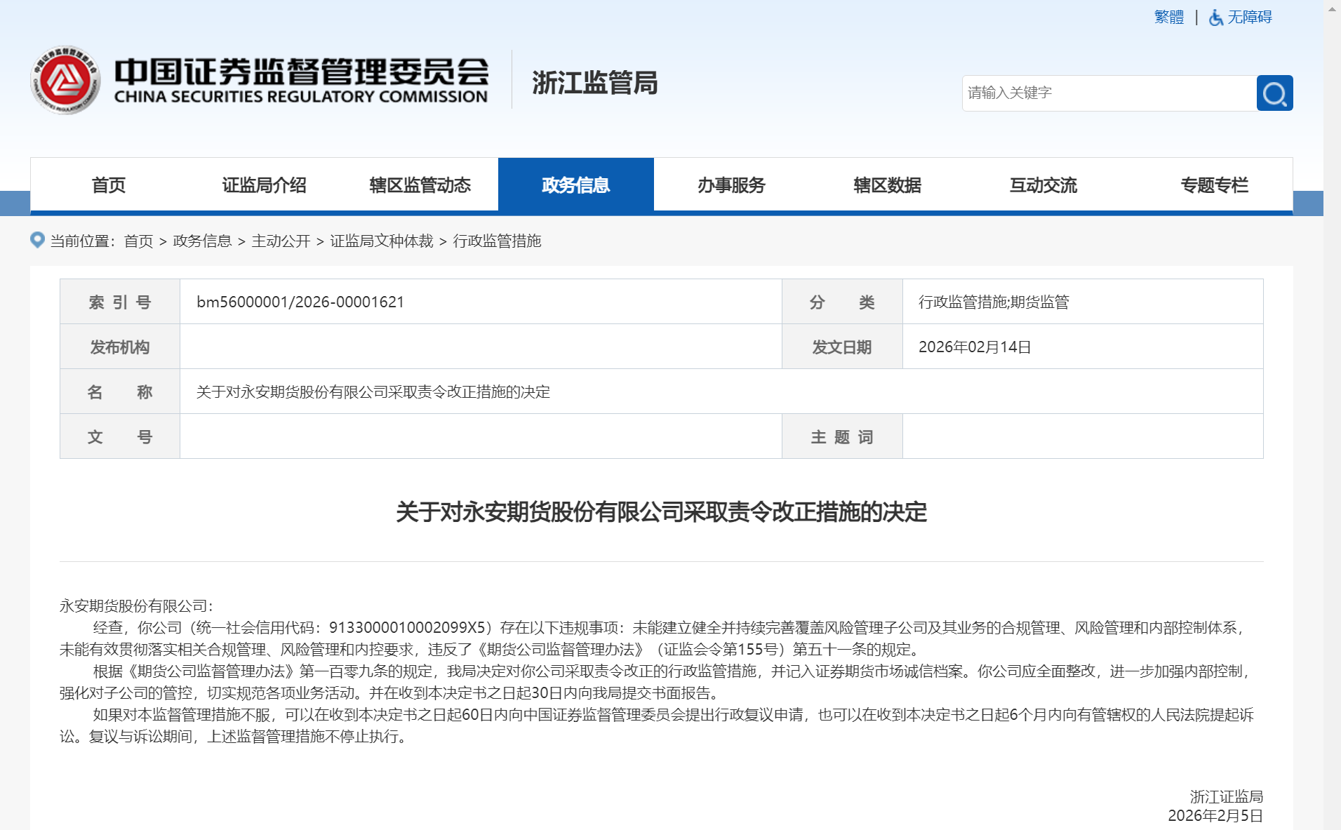 2月14日,浙江证监局官网发布对永安期货股份有限公司(以下简称永安期货)采取责令改正措施的决定。同时,浙江证监局还发布了对相关责任高管马志伟、黄志明、葛国栋采取出具警示函措施的决定。