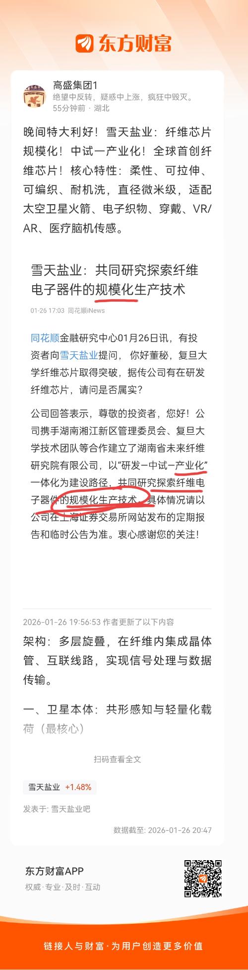晚间特大利好!雪天盐业:纤维芯片规模化!中试—产业化!全球首创纤维芯片!核心特性:柔性、可拉伸、可编织、耐机洗,直径微米级,适配太空卫星火箭、电子织物、穿戴、VR/AR、医疗脑机传感。