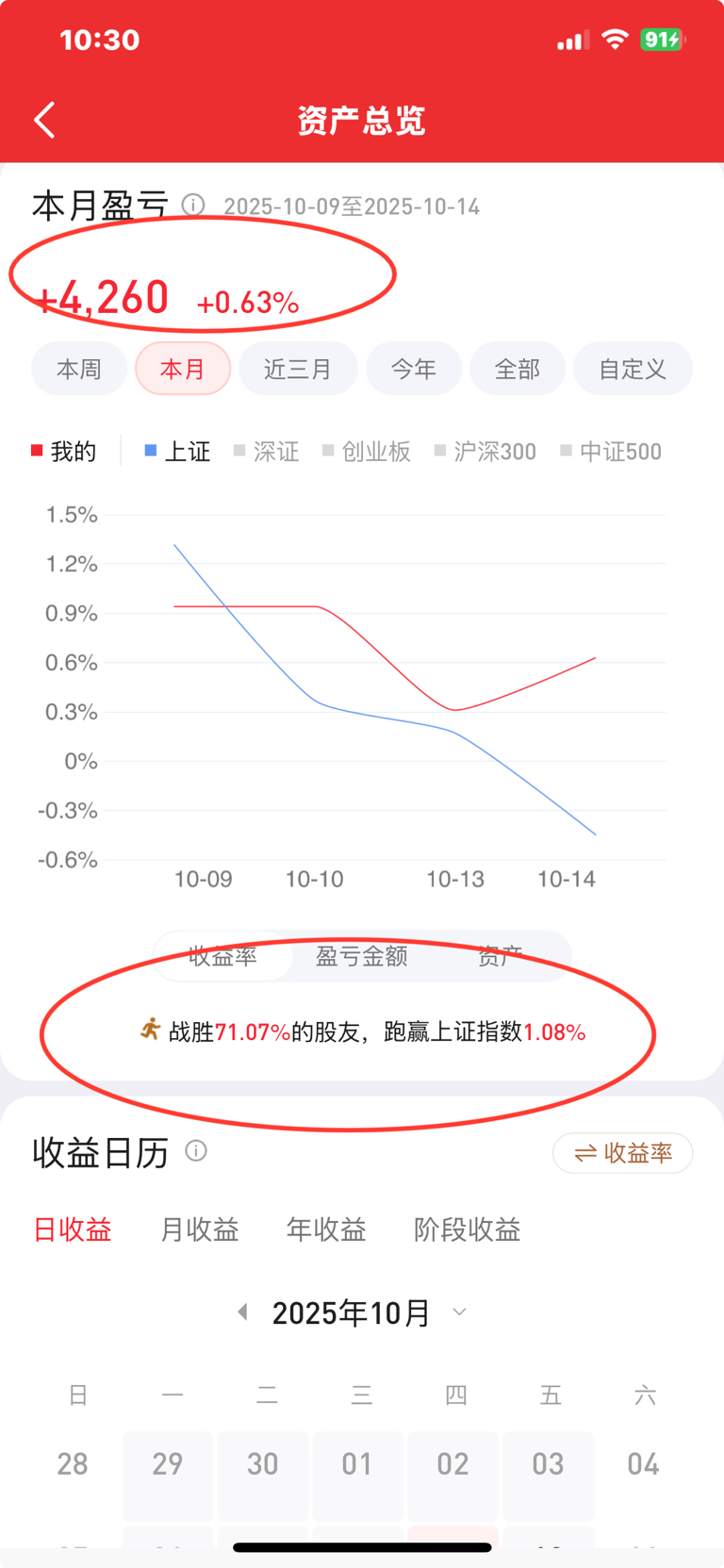 先报成绩:10月小赚4 260元,收益率0.63%,再次混进“一赚”的VIP包厢。钱不多,却跑赢七成同袍,充分诠释“不亏就是赢”的A股生存法则。