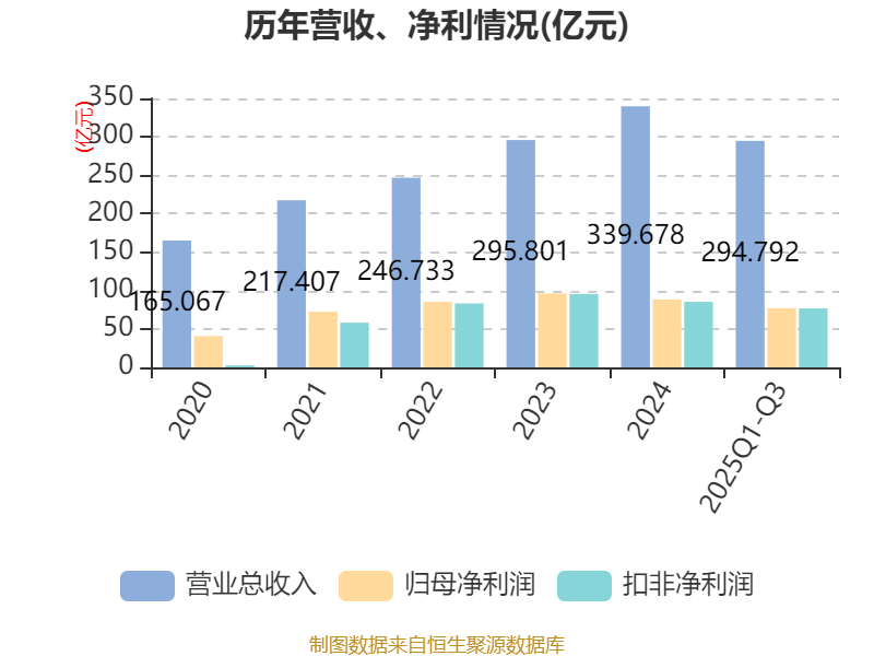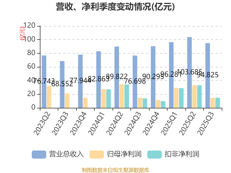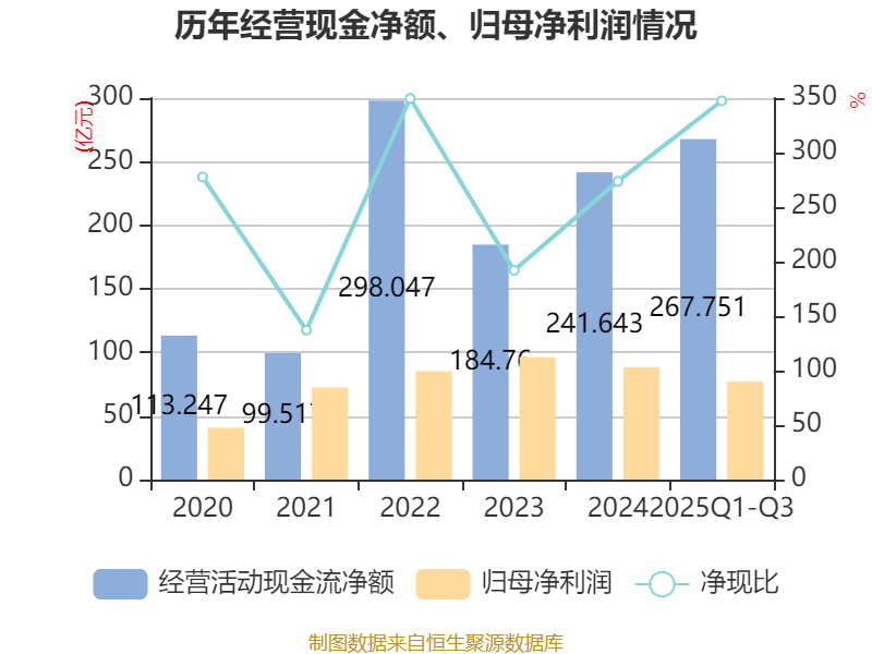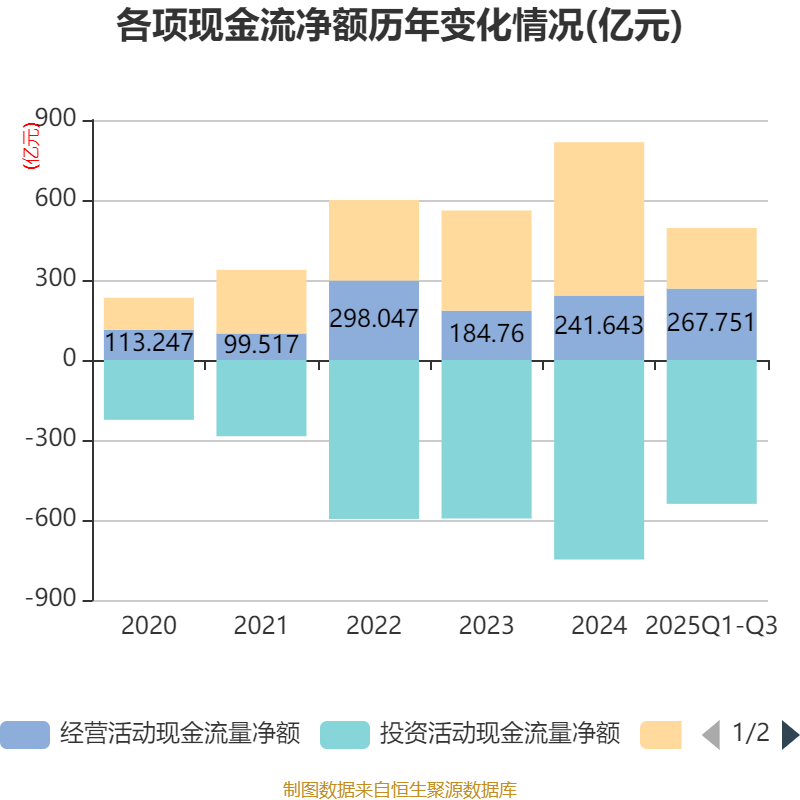 2025年前三季度,公司经营活动现金流净额为267.75亿元,同比增长60.26%;筹资活动现金流净额227.35亿元,同比减少156.46亿元;投资活动现金流净额-539.41亿元,上年同期为-475.07亿元。