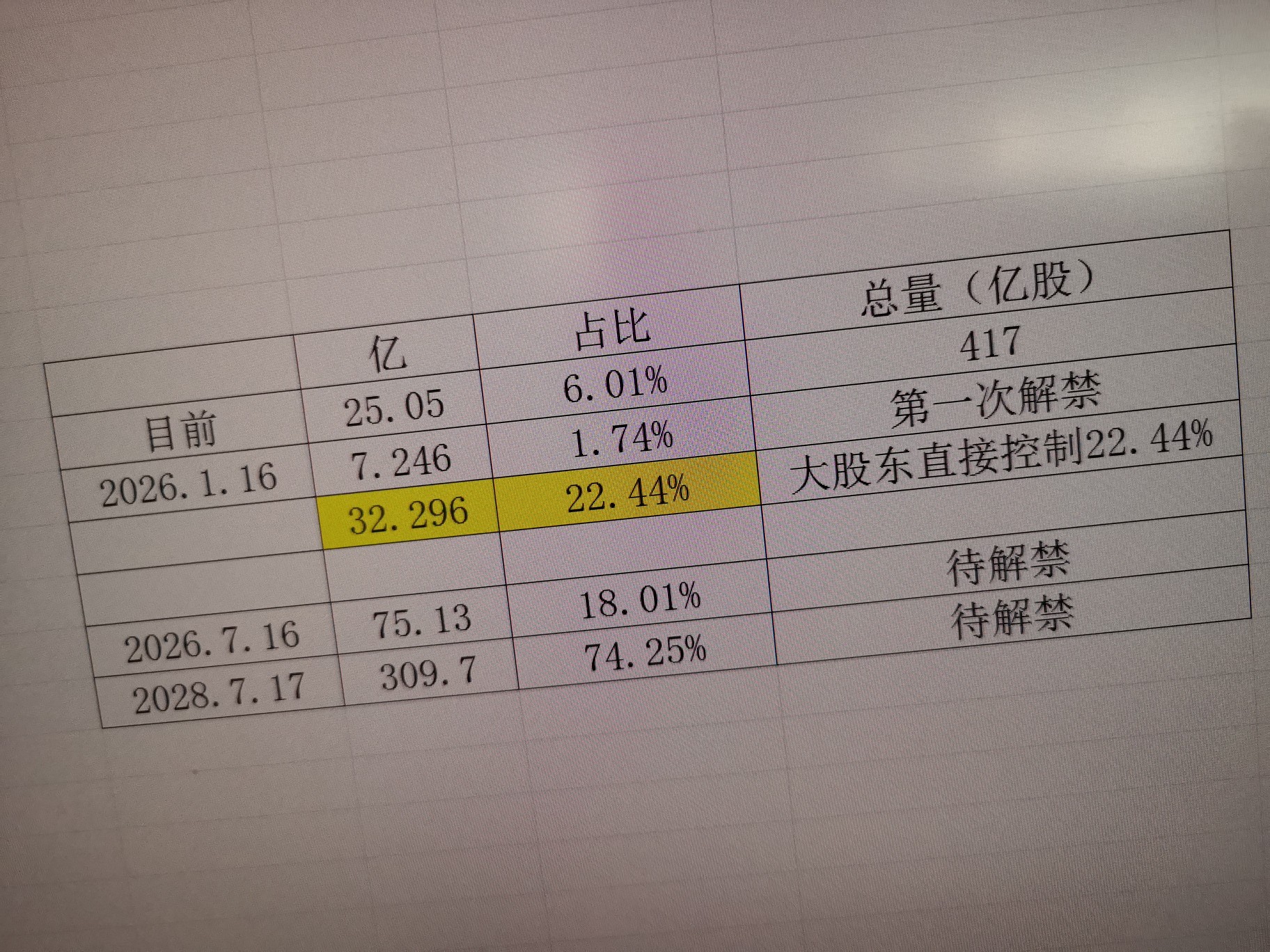 $华电新能(SH600930)$ 2026年1月16日将迎来首次解禁,当前总股本25亿股,本次解禁1家大股东所持7亿股,解禁后市场总股本增至32亿股,该大股东直接持股占比达22.44%(7亿股/32亿股),具备绝对控盘基础。