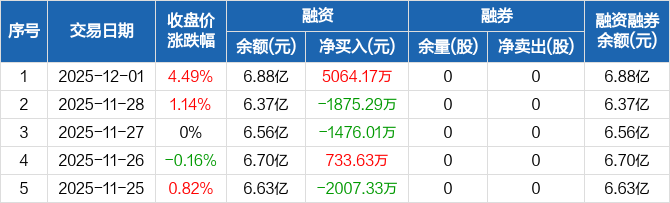 融资方面,当日融资买入2.01亿元,融资偿还1.5亿元,融资净买入5064.17万元。融券方面,融券卖出0股,融券偿还0股,融券余量0股,融券余额0元。融资融券余额合计6.88亿元。