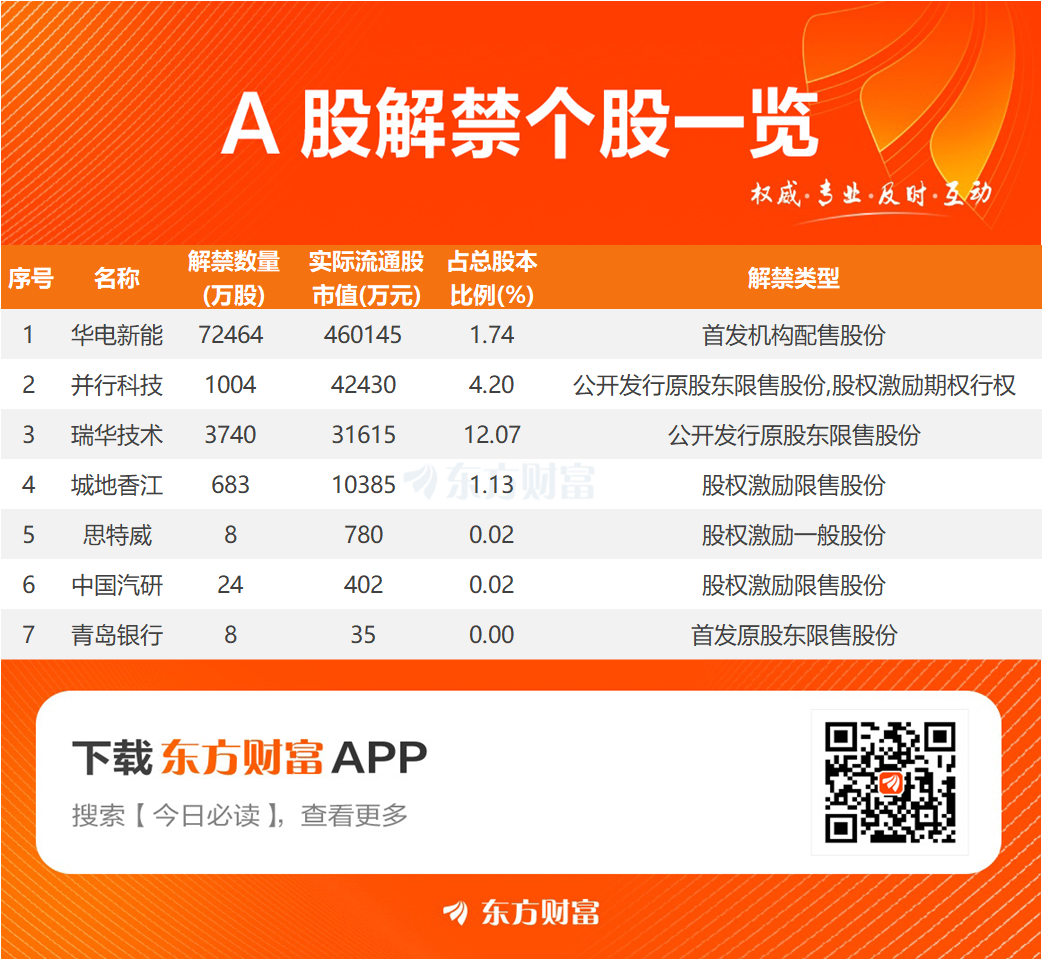 【明日解禁】明日7股解禁 华电新能、并行科技解禁市值居前