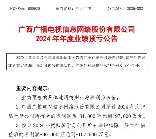 1月17日晚间,广西广电(600936.SH)发布公告称,预计2024年度实现归母净利润-8.1亿元到-9.7亿元,扣非净利润-9亿元到-10.75亿元;而上年同期亏损6.98亿元,扣非净利润-8.02亿元。