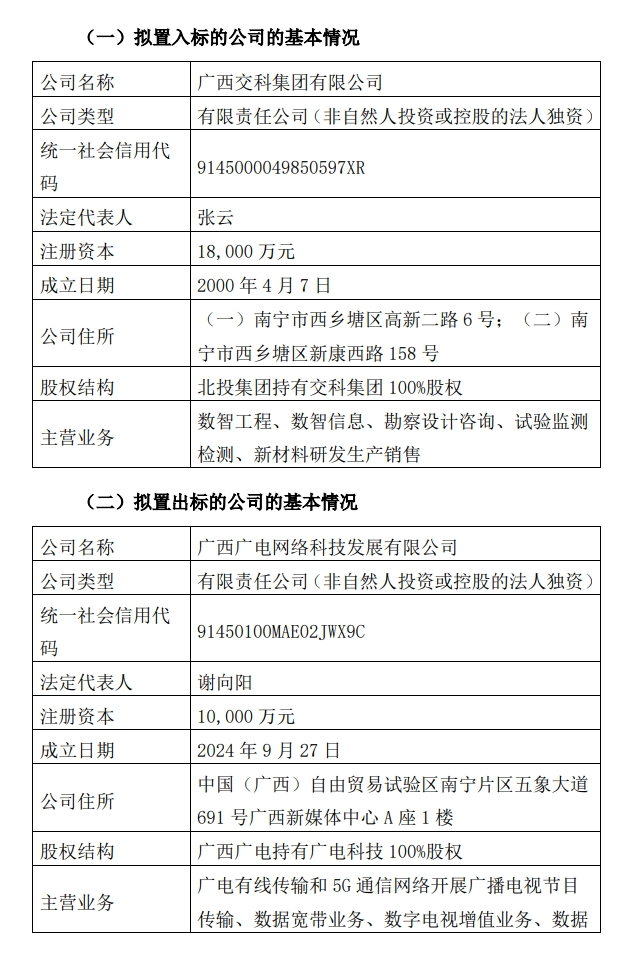 该公告显示,广西广电于1月17日收到北投集团发送的《告知函》,北投集团拟将其持有的广西交科集团有限公司(简称“交科集团”)不低于51%股权与公司持有的广西广电网络科技发展有限公司(简称“广电科技”)100%股权进行置换,本次置入资产和置出资产的交易作价预计不存在差额,不涉及发行股份购买资产,不涉及支付现金对价。