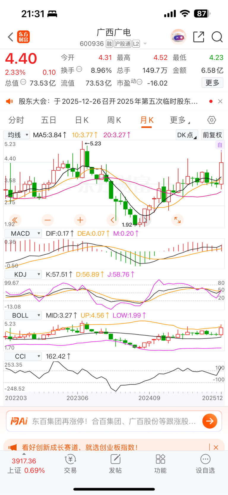 $广西广电(SH600936)$ 还有32个交易日就过年了,过年前能不能突破5.23啊?