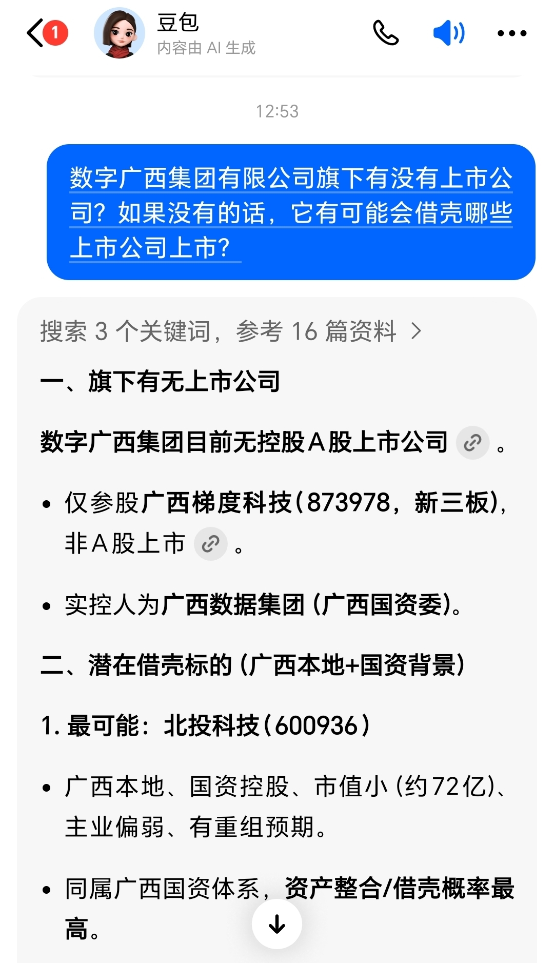 豆包说:广西数字集团最可能借壳北投科技上市或者将置入北投科技,详见图片内容@妙想