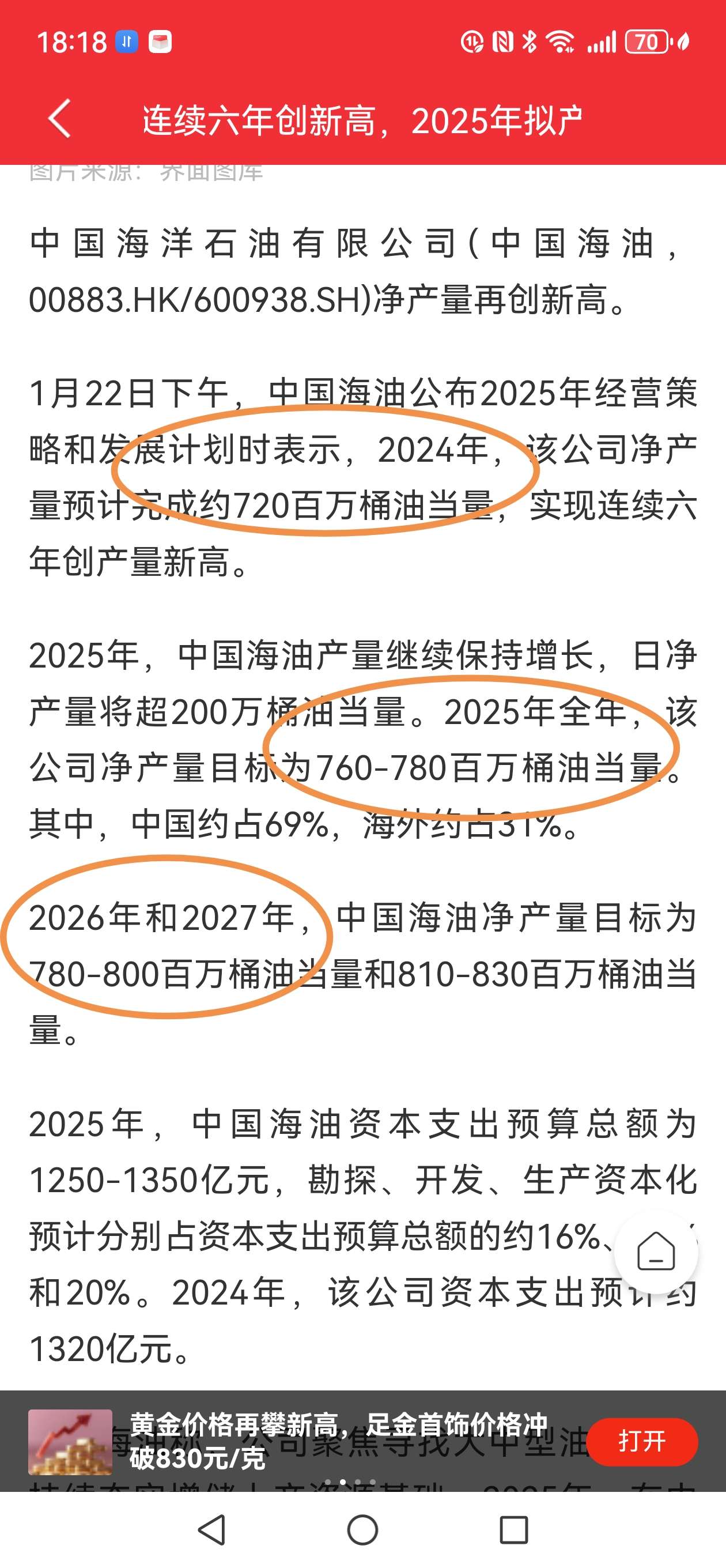 $中国海油(SH600938)$ 中国海油2025年股利支付率不低于45%。2024股利支付率是43.84%。在三桶油里股利支付率最高的是中国石化69.02%,中国石油是49.97%。但是2024到2027的产能计划显著提高,2024年产能720百万桶,2025年760~780百万桶,2026和2027产能780百万到800百万桶。只有中海油敢于预测未来的产能。受利好刺激的影响,今天不管是中国海油A股还是h股尾盘上翘收盘。