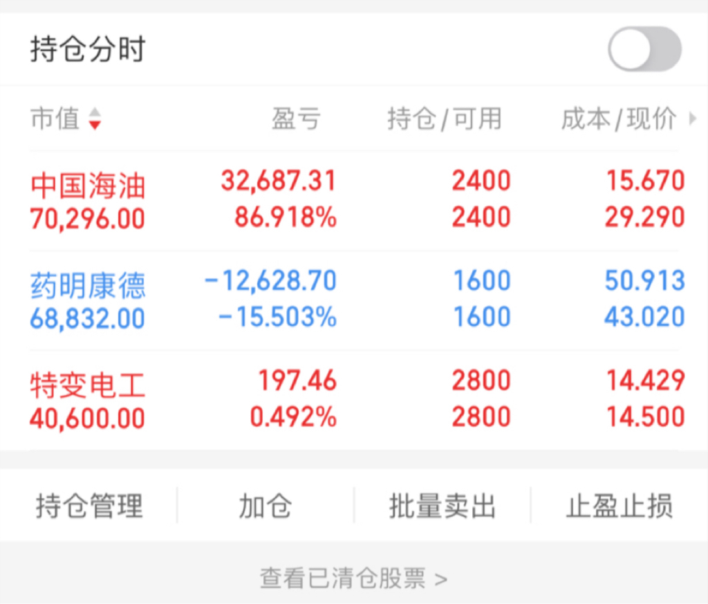 第一张是去年4/12发的,那时候海油走完了它最出名的一次主升浪。那会资金量尚小,底仓设定的2400股,如今4800股已经翻倍,股价原地踏步甚至倒退,不过依靠前期做T累积和分红,今天的盈利较当天仍多了1000多块。