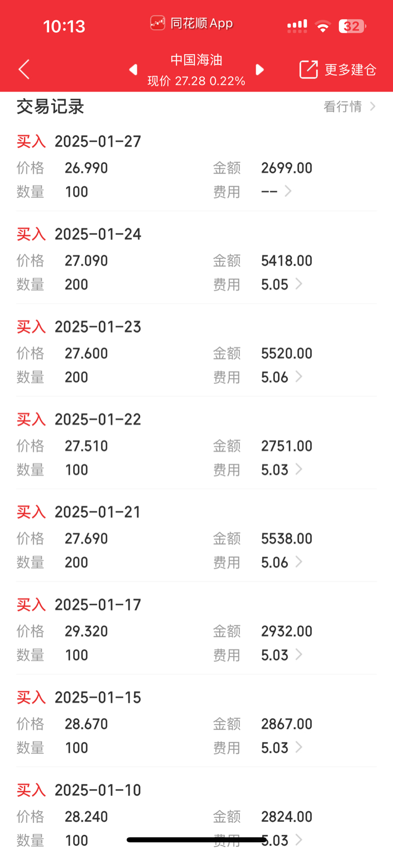 以26.99元买入海油100股,现持0.51万股,持仓量连续五个交易日创新高,五日共加仓800股,成交均价27.408元。购物暂时告一段落再加100股将逼近成本控制线(20.99元),节后空头如果没有收敛,将在26.50元附近继续挂买单