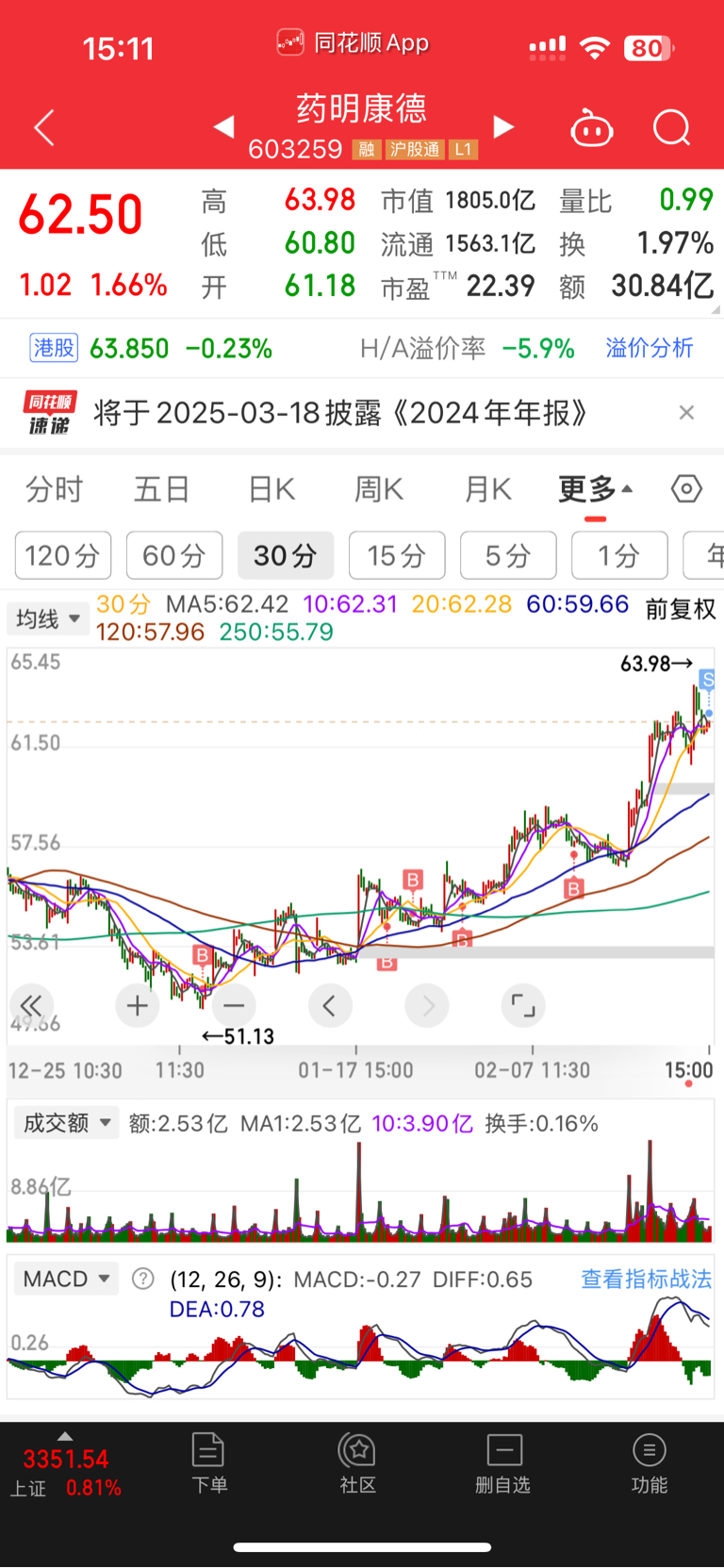 以62.50元卖出药明200股,考虑到今天上涨量能略差,前期加仓点位较多,故选择在此处稍T一下,不排除明天直接放量反包上影线的可能。维持药明康德2025年目标价84.89元不变。