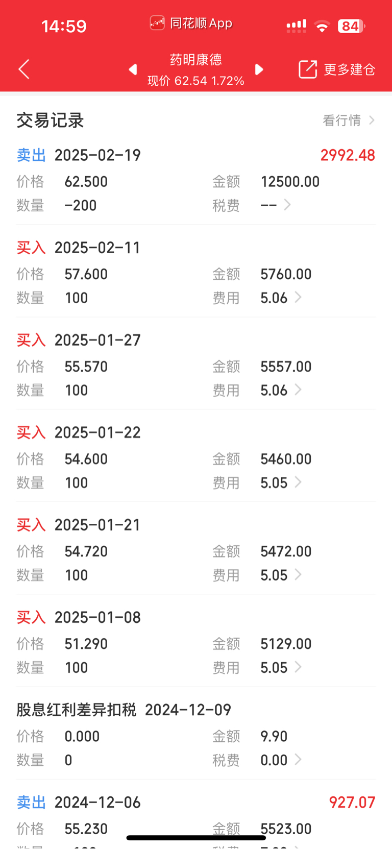 截止今日收盘,本年度净买入药明300股,其中买入500股,买入均价54.756元;卖出200股,卖出均价62.500元;平均每股盈利7.44元(扣除红利税、交易费用后)。