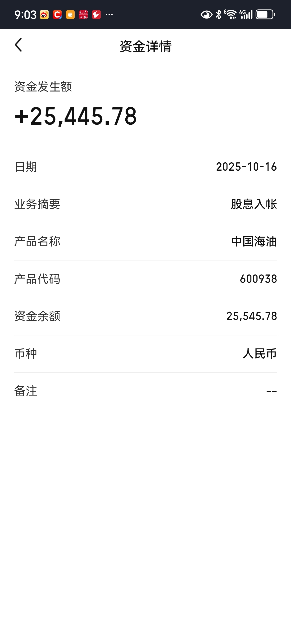 $中国海油(SH600938)$ 股息到账,继续择机复投