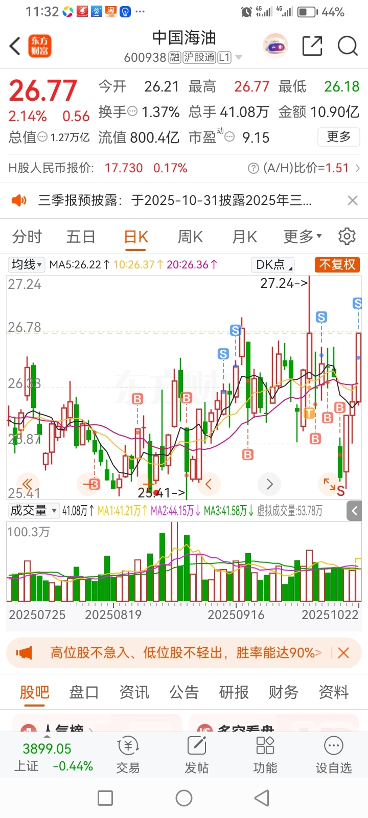 $中国海油(SH600938)$ 卖早了26.57,等下来了再加。