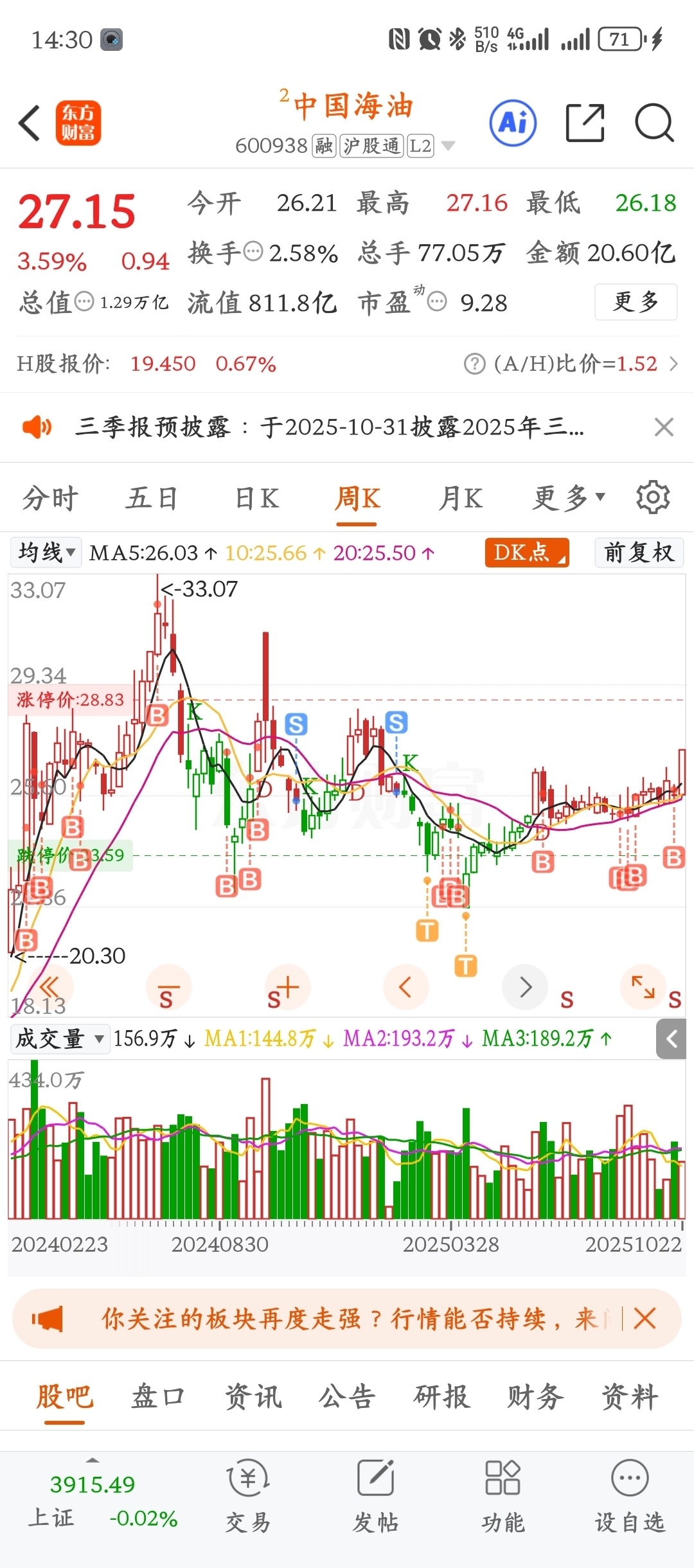$中国海油(SH600938)$ 太久没有这么涨过了,1年多了才回到我27以上