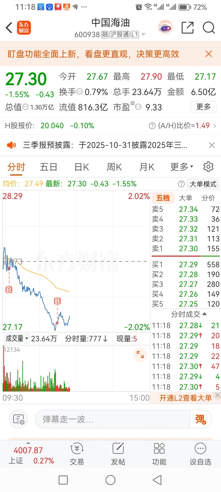 $中国海油(SH600938)$ 以全仓杀入,不做T了。26.7卖了27.5全加仓。