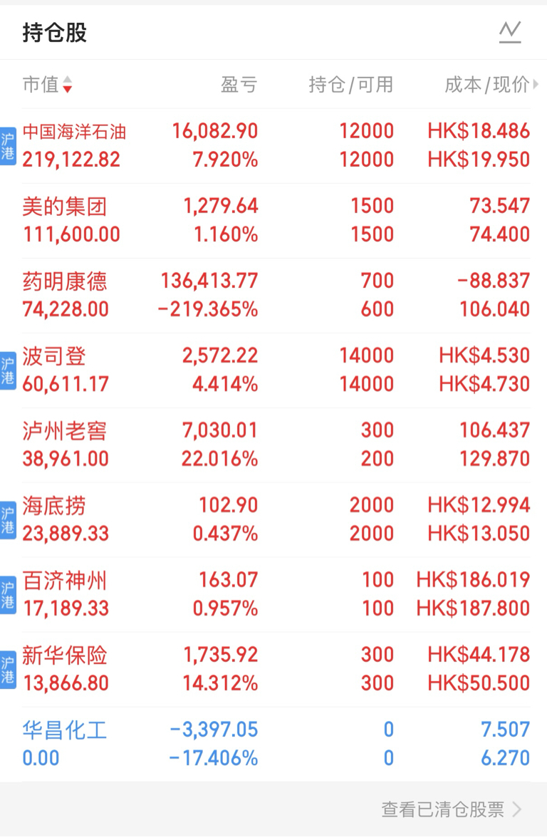 华昌发布三季报,多元醇等相关产品继续探底,叠加近日持仓股除海油H外走势均较弱,故暂时清仓以集中持仓。持股建议:如有现金,且其他持仓股无加仓意愿,仍可继续持股观察,注意控制仓位在5%以内,等待加仓时机(当前1.1 PB市净率接近历史最低位)。