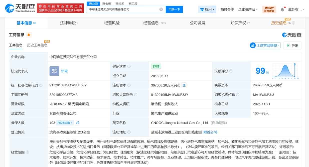中海油江苏天然气公司增资至约30.7亿 增幅约15%