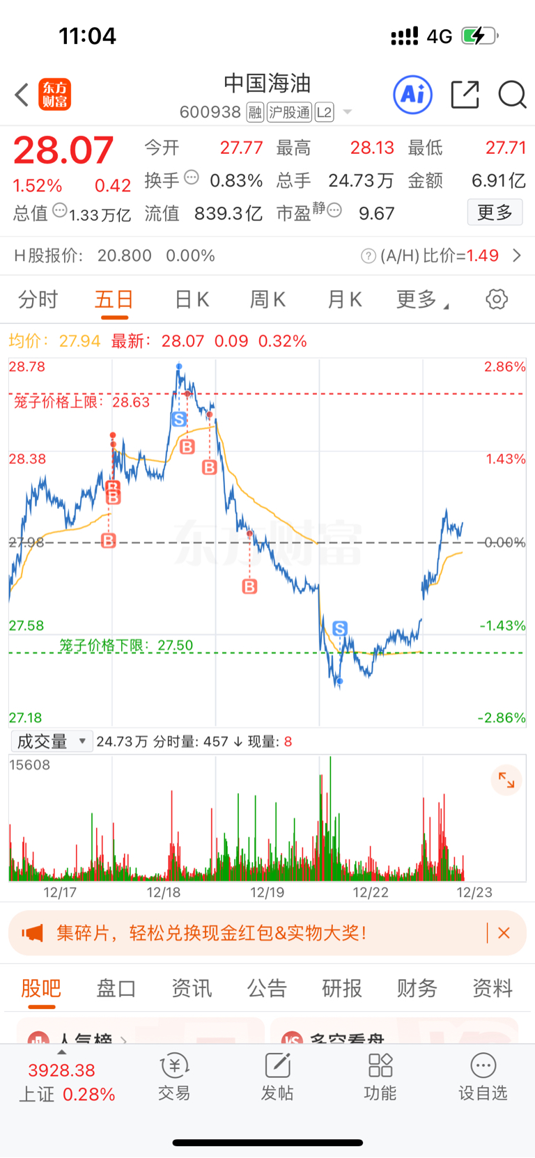 $中国海油(SH600938)$ 很难回本了,本来只需要0.5个点回本,吃了两天大面,昨天割在最低点。
