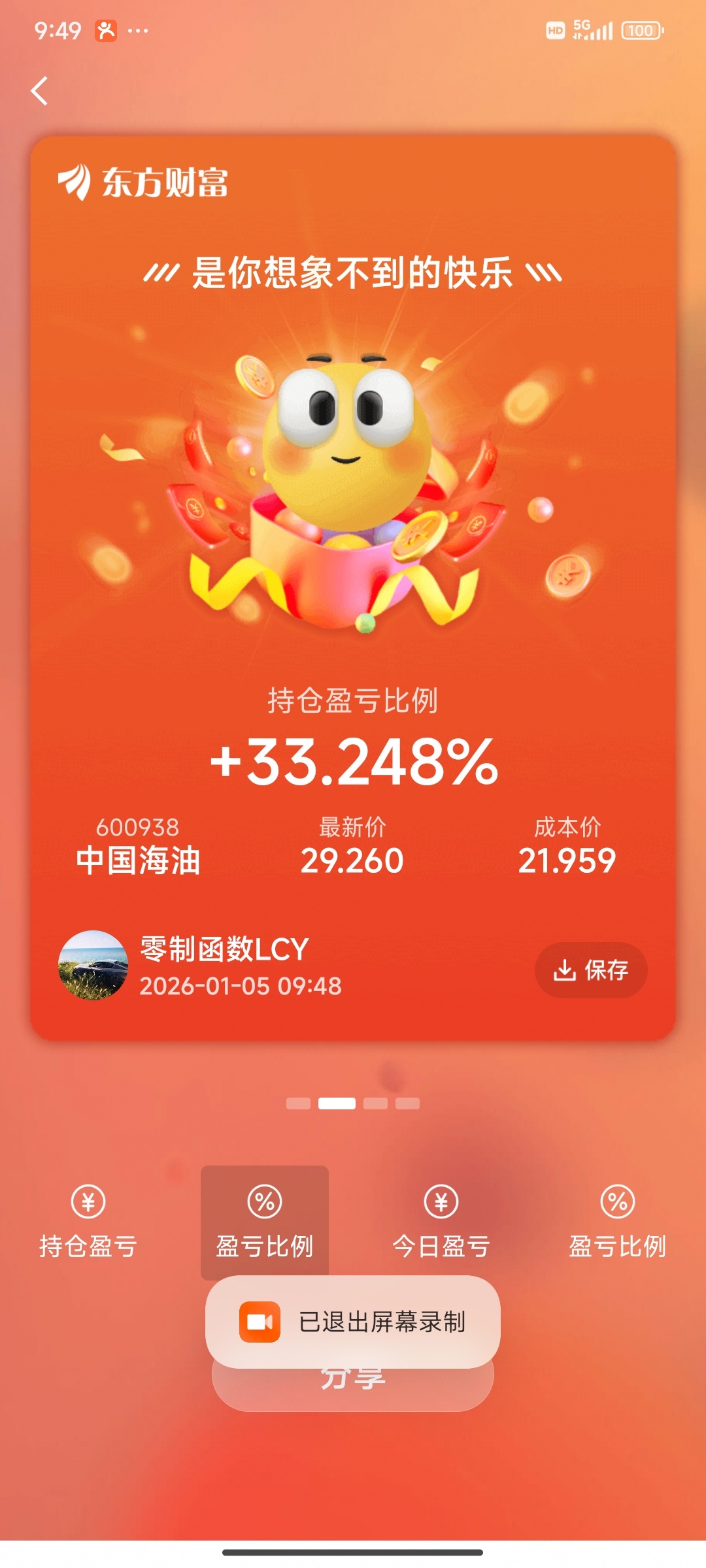 $中国海油(SH600938)$ 最近五天涨的有点多1400股卖出400股,还是有些贪心了应该元旦前卖的