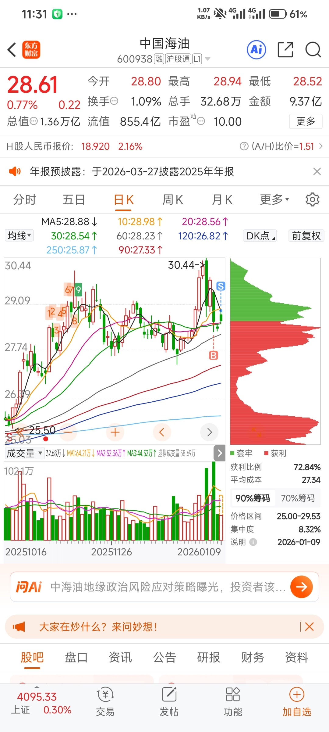 $中国海油(SH600938)$ 大盘16阳,已经人声鼎沸了,今天要感谢石化带了下这垃圾让我跑了,等下周散户哀嚎时候再来。这票不要被股吧那几个股托忽悠,下面获利盘太多,没人抬轿的。