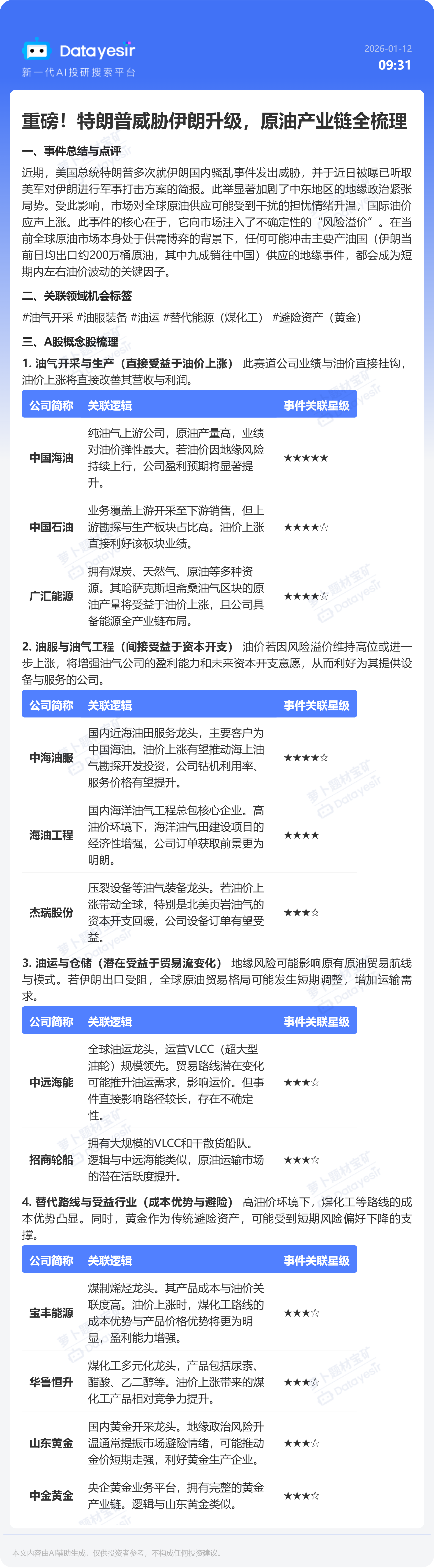 重磅!特朗普威胁伊朗升级,原油产业链全梳理